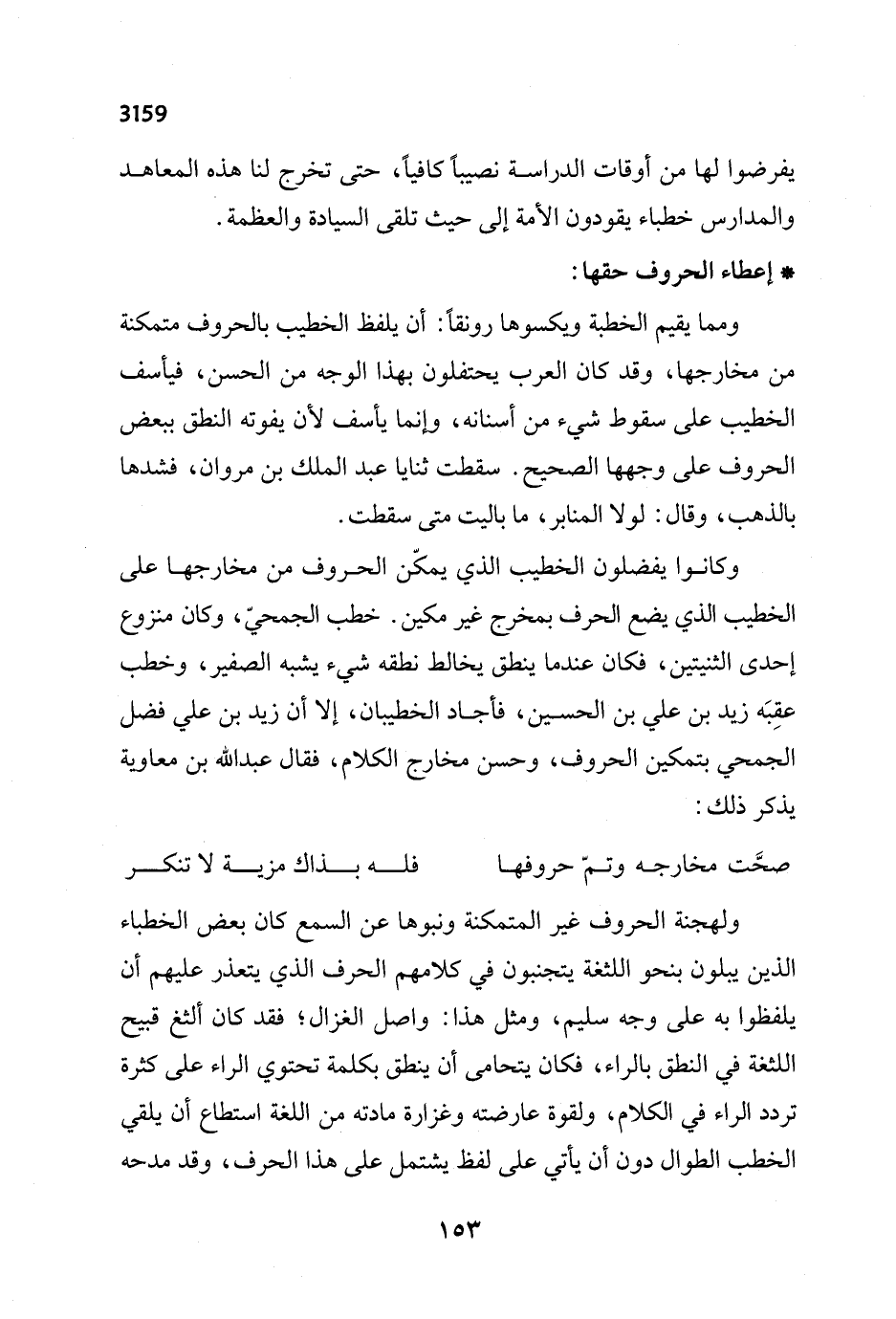 ومما يقيم الخطبة ويكسوها رونقاً: أن يلفظ الخطيب بالحروف متمكنة من مخارجها، وقد كان العرب يحتفلون بهذا الوجه من الحسن، فيأسف الخطيب على سقوط شيء من أسنانه، وإنما يأسف لأن يفوته النطق ببعض الحروف على وجهها الصحيح. سقطت ثنايا عبد الملك بن مروان، فشدها بالذهب، وقال: لولا المنابر، ما باليت متى سقطت.