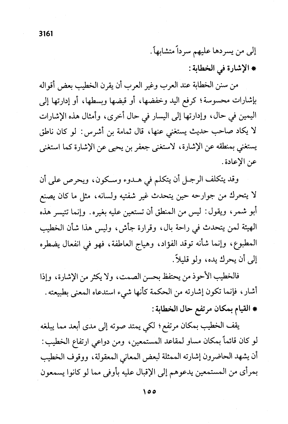 فالخطيب الأحوذ من يحتفظ بحسن الصمت, ولا يكثر من الإشارة، وإذا أشار، فإنما تكون إشارته من الحكمة كأنها شيء استدعاه المعنى بطبيعته.