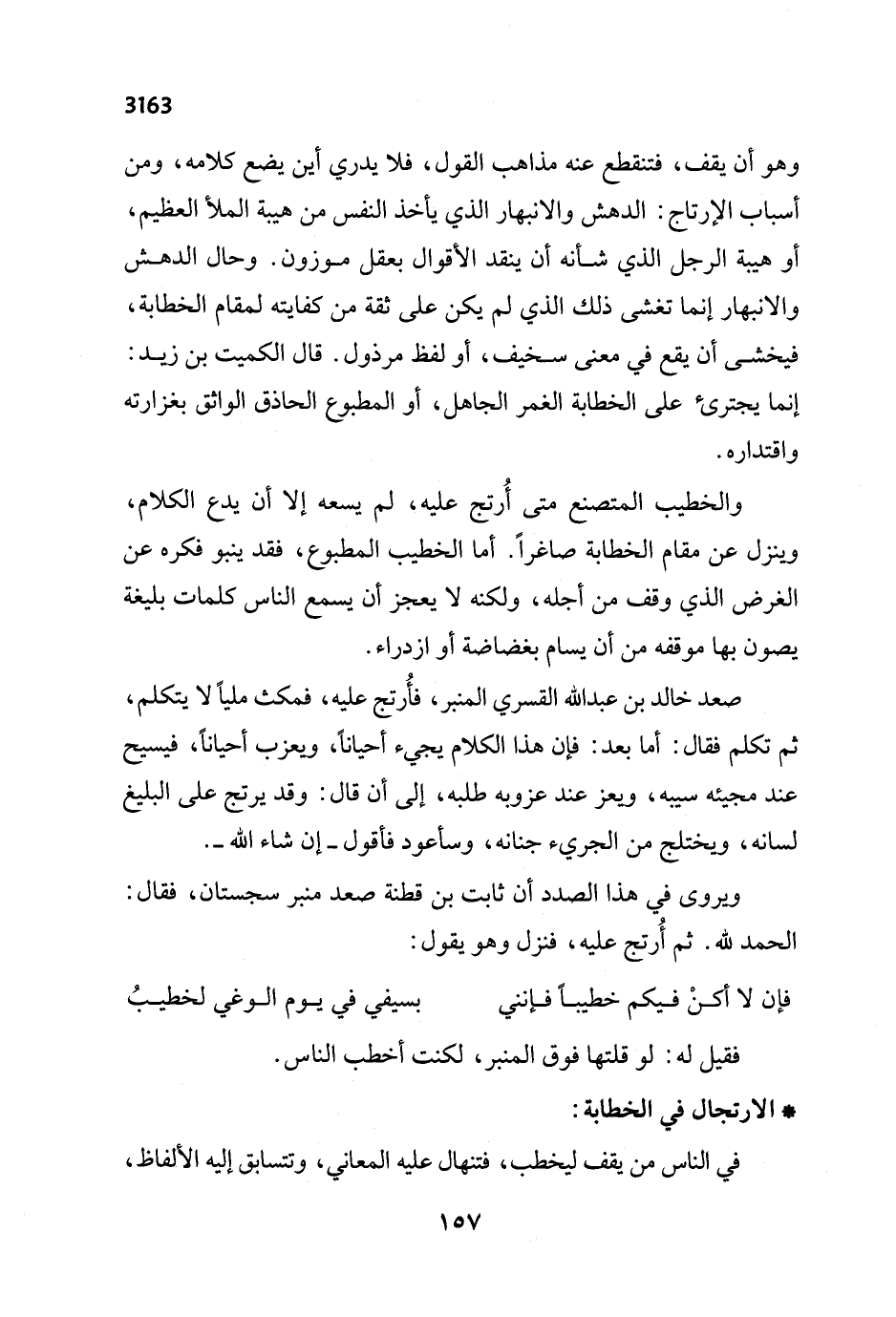 صعد خالد بن عبد الله القسري المنبر، فأُرتج عليه، فمكث ملياً لا يتكلم، ثم تكلم فقال: أما بعد: فإن هذا الكلام يجيء أحياناً، ويعزب أحياناً، فيسيح عند مجيئه سيبه، ويعز عند عزوبه طلبه، إلى أن قال: وقد يرتج على البليغ لسانه، ويختلج من الجريء جنانه، وسأعود فأقول -إن شاء الله-.
