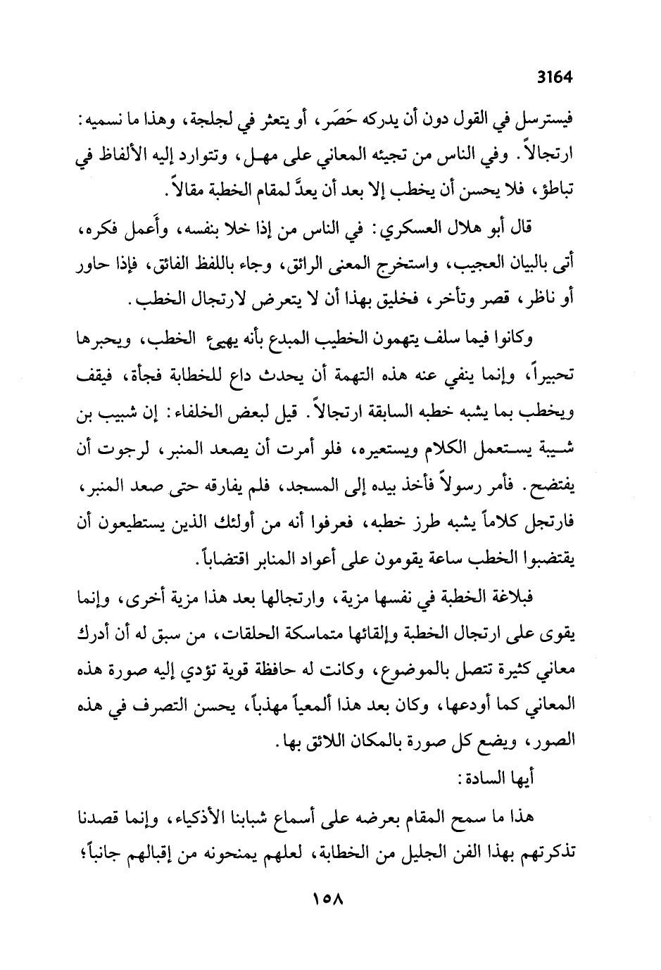 فيسترسل في القول دون أن يدركه حَصَر، أو يتعثر في لجلجة، وهذا ما نسميه: ارتجالاً. وفي الناس من تجيئه المعاني على مهل، وتتوارد إليه الألفاظ في تباطؤ، فلا يحسن أن يخطب إلا بعد أن يعدَّ لمقام الخطبة مقالاً.