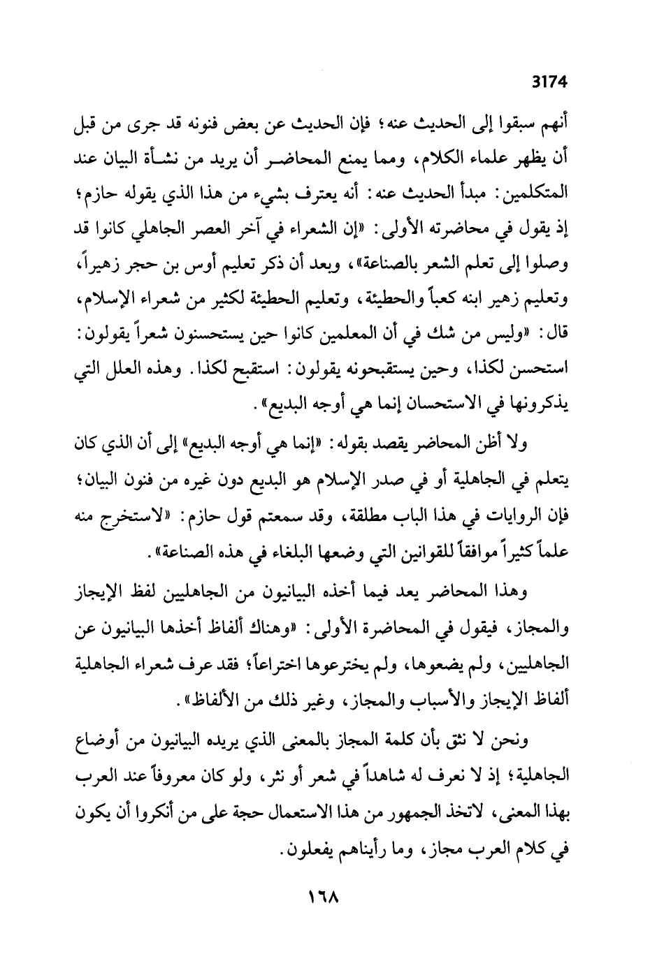 ولا أظن المحاضر يقصد بقوله: "إنما هي أوجه البديع" إلى أن الذي كان يتعلم في الجاهلية أو في صدر الإسلام هو البديع دون غيره من فنون البيان؛ فإن الروايات في هذا الباب مطلقة، وقد سمعتم قول حازم: "لاستخرج منه علماً كثيراً موافقاً للقوانين التي وضعها البلغاء في هذه الصناعة".