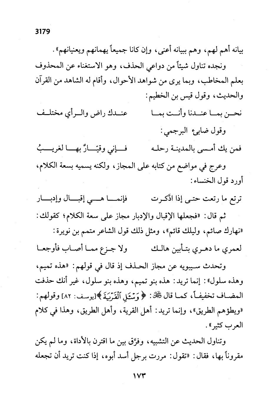 وتحدث سيبويه عن مجاز الحذف إذ قال في قولهم: "هذه تميم، وهذه سلول": إنما تريد: هذه بنو تميم، وهذه بنو سلول، غير أنك حذفت المضاف تخفيفًا، كما قال -عَزَّ وَجَلَّ-: {وَاسْأَلِ الْقَرْيَةَ} [يوسف: 82] وقولهم: "ويطؤهم الطريق"، وإنما تريد: أهل القرية، وأهل الطريق، وهذا في كلام العرب كثير".