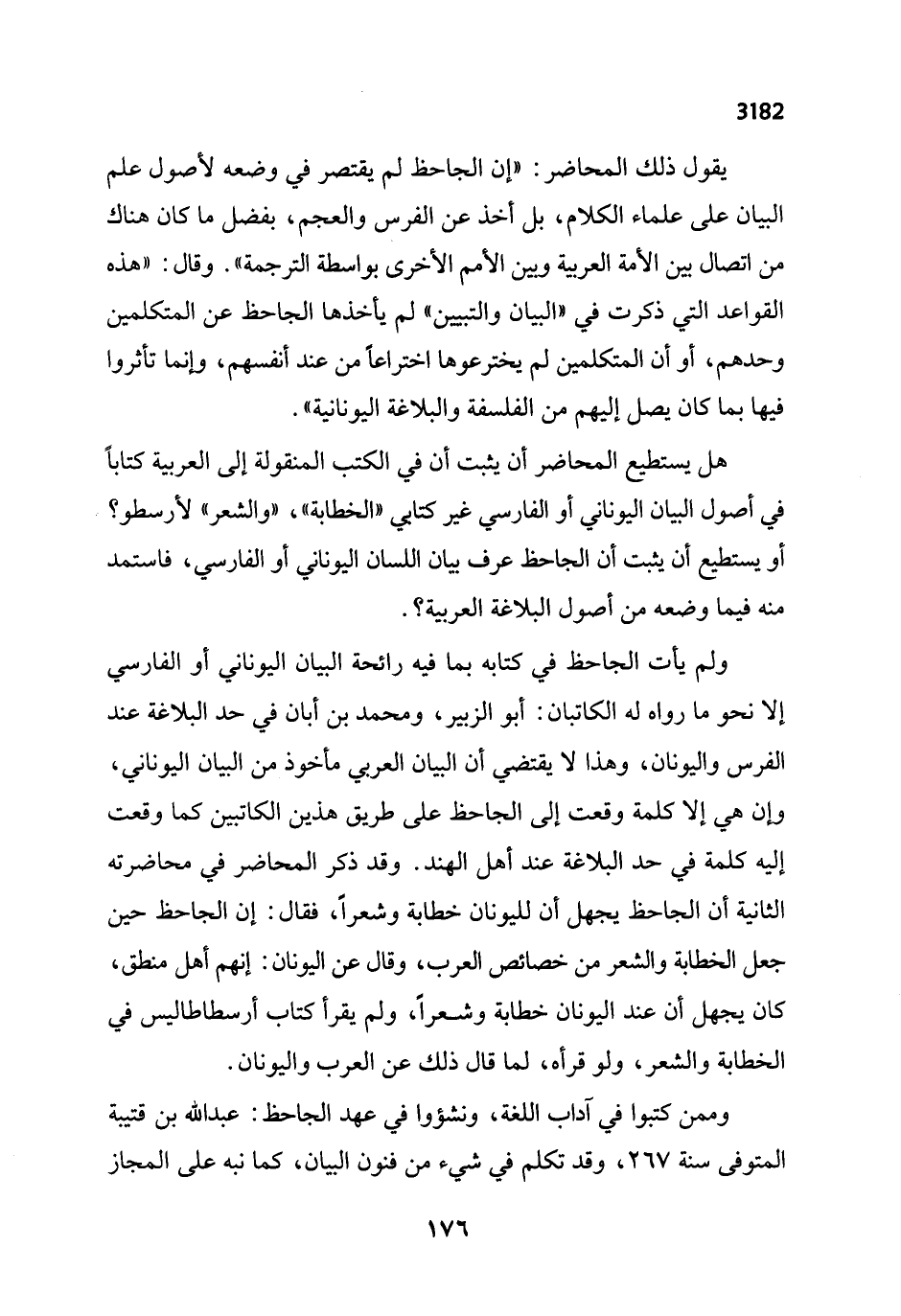 هل يستطيع المحاضر أن يثبت أن في الكتب المنقولة إلى العربية كتاباً في أصول البيان اليوناني أو الفارسي غير كتابي "الخطابة"والشعر، لأرسطو؟ أو يستطيع أن يثبت أن الجاحظ عرف بيان اللسان اليوناني أو الفارسي، فاستمد منه فيما وضعه من أصول البلاغة العربية؟.