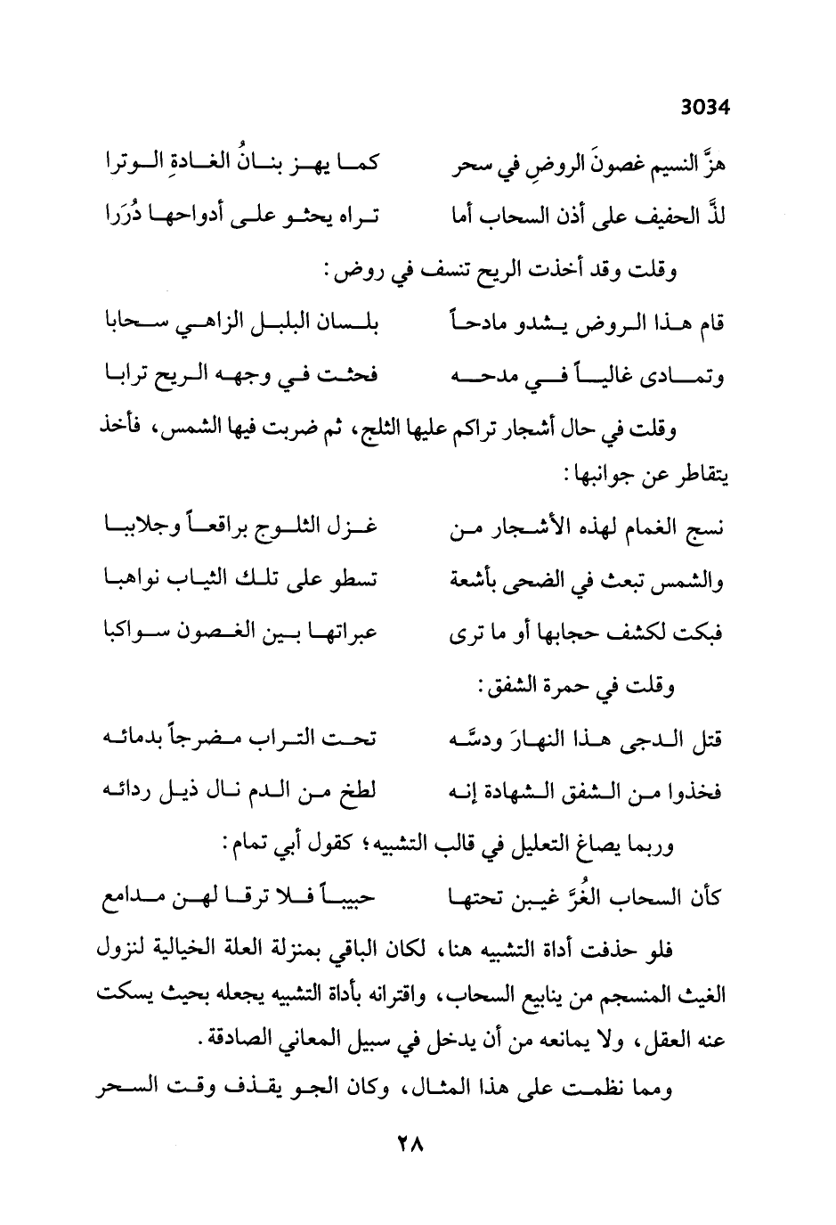 فلو حذفت أداة التشبيه هنا، لكان الباقي بمنزلة العلة الخيالية لنزول الغيث المنسجم من ينابيع السحاب، واقترانه بأداة التشبيه يجعله بحيث يسكت عنه العقل، ولا يمانعه من أن يدخل في سبيل المعاني الصادقة.
