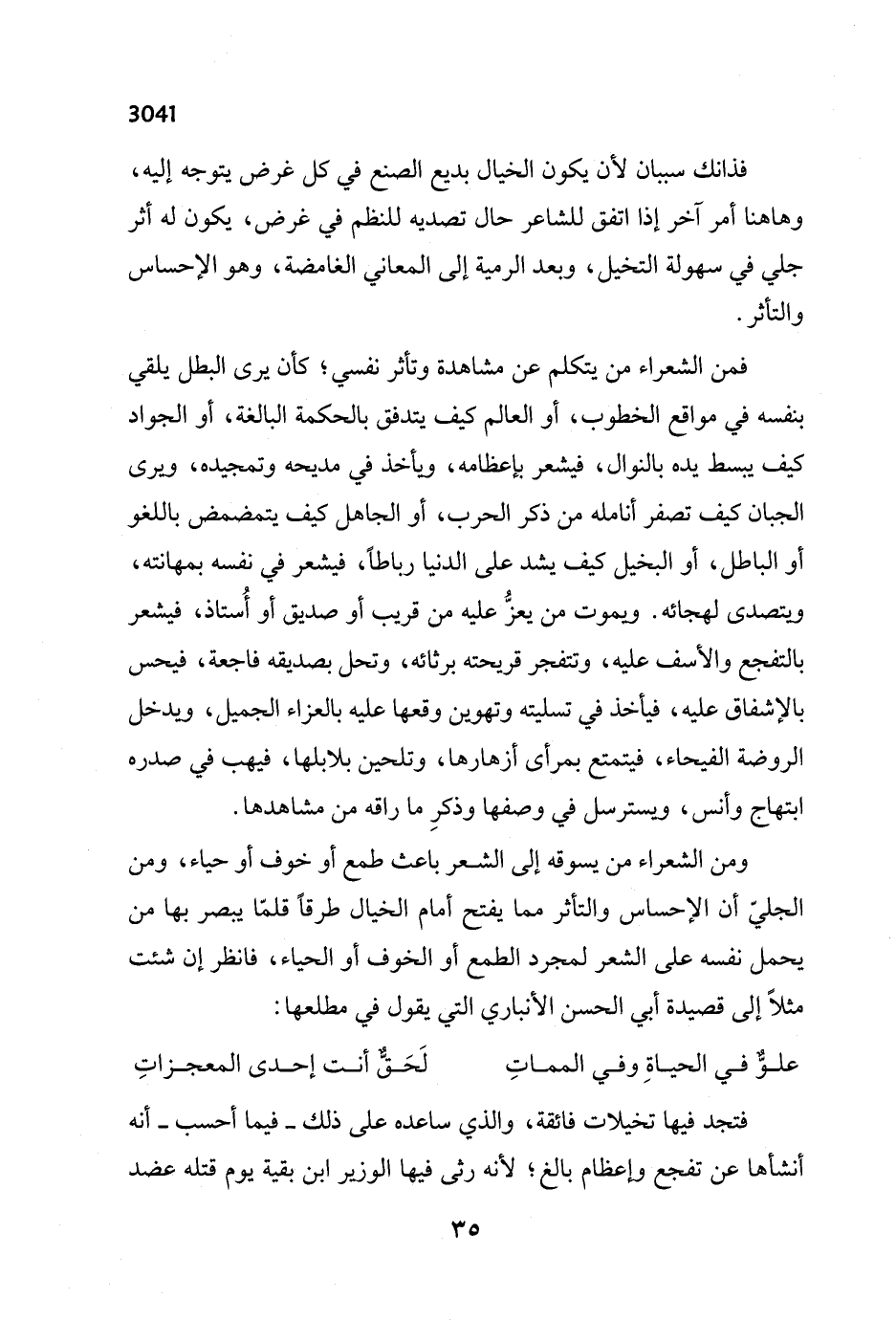 ومن الشعراء من يسوقه إلى الشعر باعث طمع أو خوف أو حياء، ومن الجليّ أن الإحساس والتأثر مما يفتح أمام الخيال طرقاً قلمّا يبصر بها من يحمل نفسه على الشعر لمجرد الطمع أو الخوف أو الحياء، فانظر إن شئت مثلاً إلى قصيدة أبي الحسن الأنباري التي يقول في مطلعها: