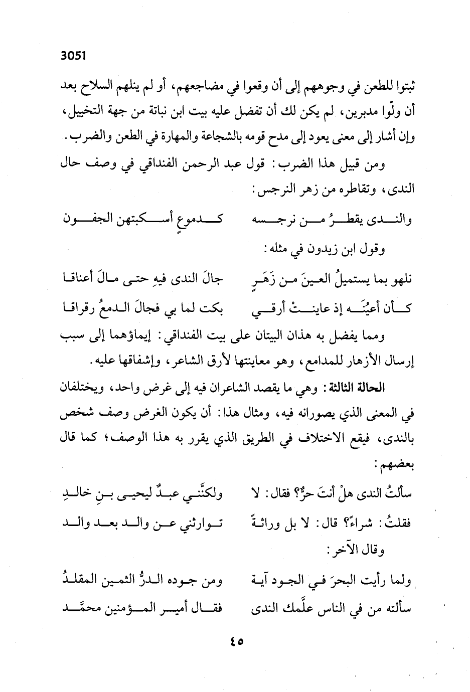 الحالة الثالثة: وهي ما يقصد الشاعران فيه إلى غرض واحد، ويختلفان في المعنى الذي يصورانه فيه، ومثال هذا: أن يكون الغرض وصف شخص بالندى، فيقع الاختلاف في الطريق الذي يقرر به هذا الوصف؛ كما قال بعضهم: