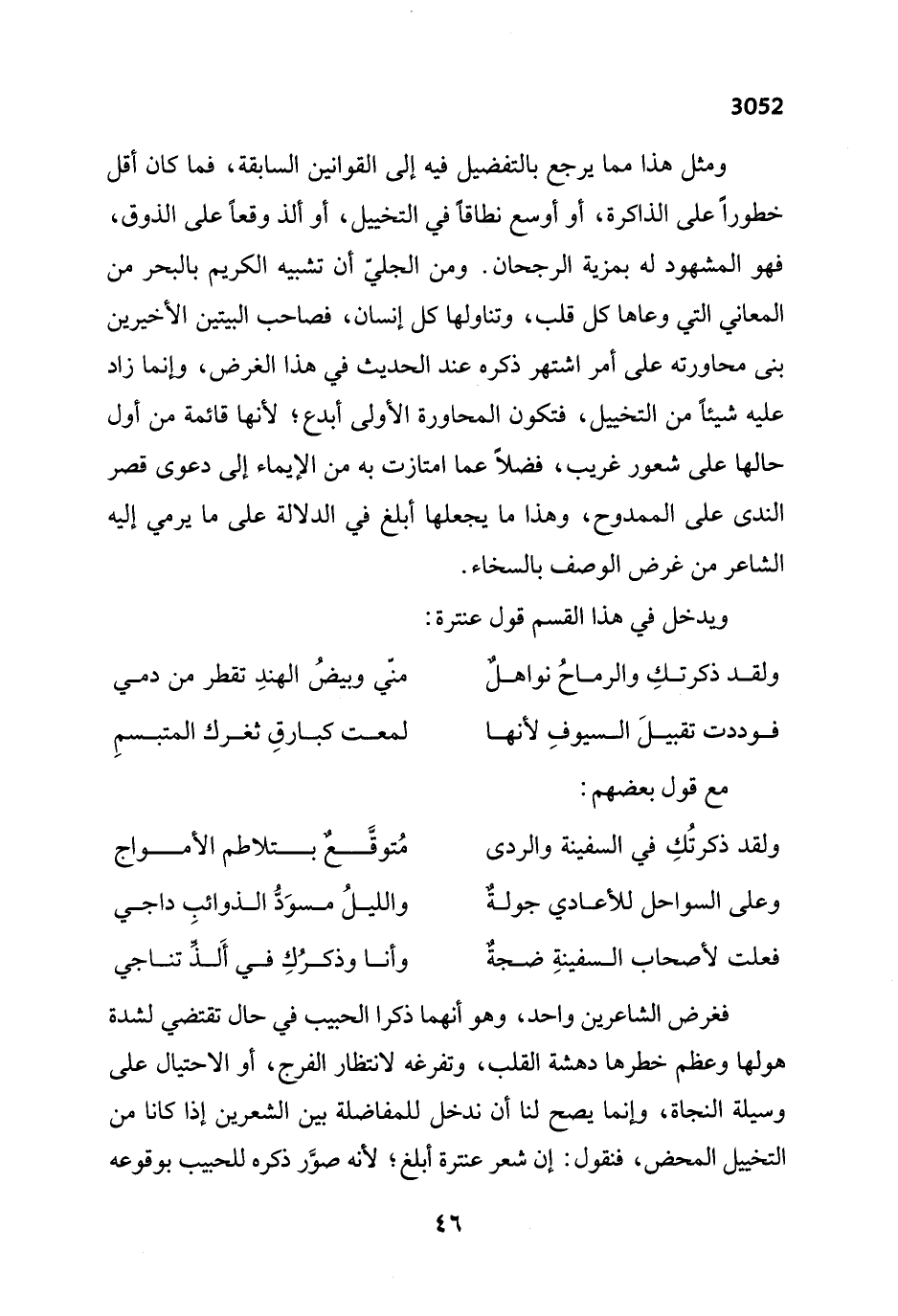 فغرض الشاعرين واحد، وهو أنهما ذكرا الحبيب في حال تقتضي لشدة هولها وعظم خطرها دهشة القلب، وتفرغه لانتظار الفرج، أو الاحتيال على وسيلة النجاة، وإنما يصح لنا أن ندخل للمفاضلة بين الشعرين إذا كانا من التخييل المحض، فنقول: إن شعر عنترة أبلغ؛ لأنه صوَّر ذكره للحبيب بوقوعه