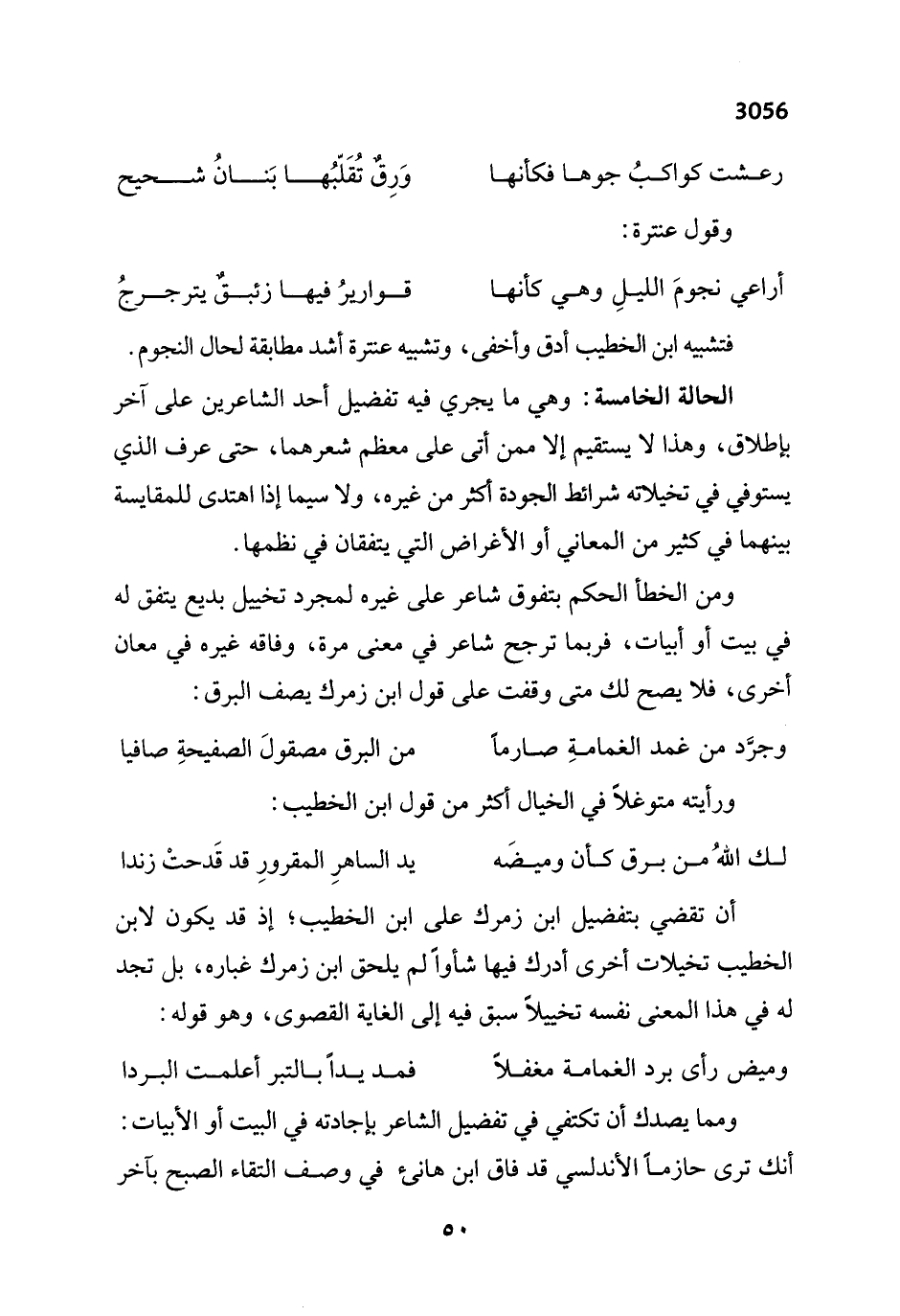 الحالة الخامسة: وهي ما يجري فيه تفضيل أحد الشاعرين على آخر بإطلاق، وهذا لا يستقيم إلا ممن أتى على معظم شعرهما، حتى عرف الذي يستوفي في تخيلاته شرائط الجودة أكثر من غيره، ولا سيما إذا اهتدى للمقايسة بينهما في كثير من المعاني أو الأغراض التي يتفقان في نظمها.