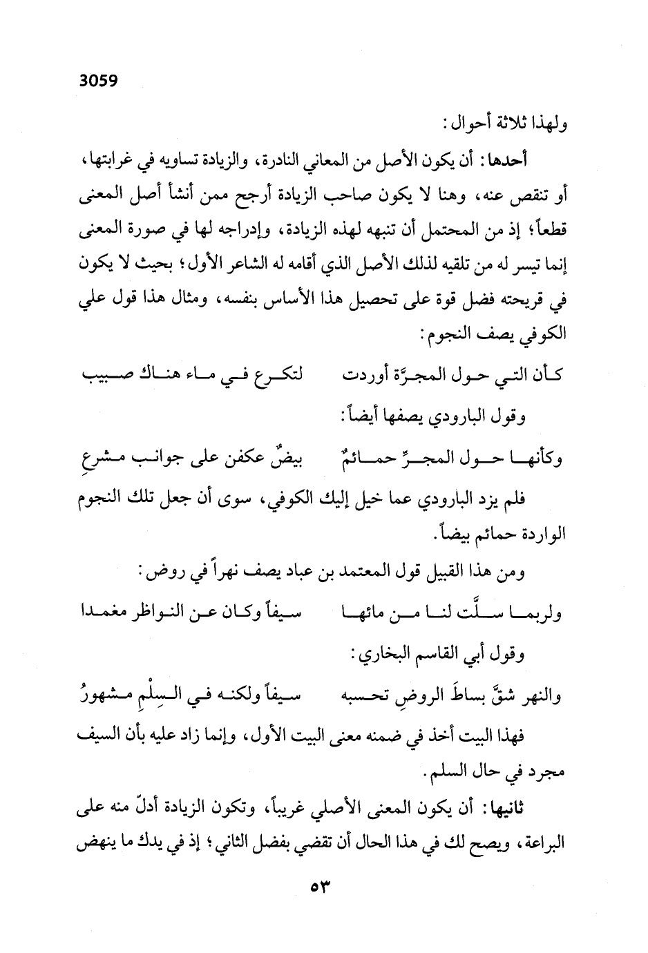 أحدها: أن يكون الأصل من المعاني النادرة، والزيادة تساويه في غرابتها، أو تنقص عنه، وهنا لا يكون صاحب الزيادة أرجح ممن أنشأ أصل المعنى قطعاً؛ إذ من المحتمل أن تنبهه لهذه الزيادة، وإدراجه لها في صورة المعنى إنما تيسر له من تلقيه لذلك الأصل الذي أقامه له الشاعر الأول؛ بحيث لا يكون في قريحته فضل قوة على تحصيل هذا الأساس بنفسه، ومثال هذا قول علي الكوفي يصف النجوم: