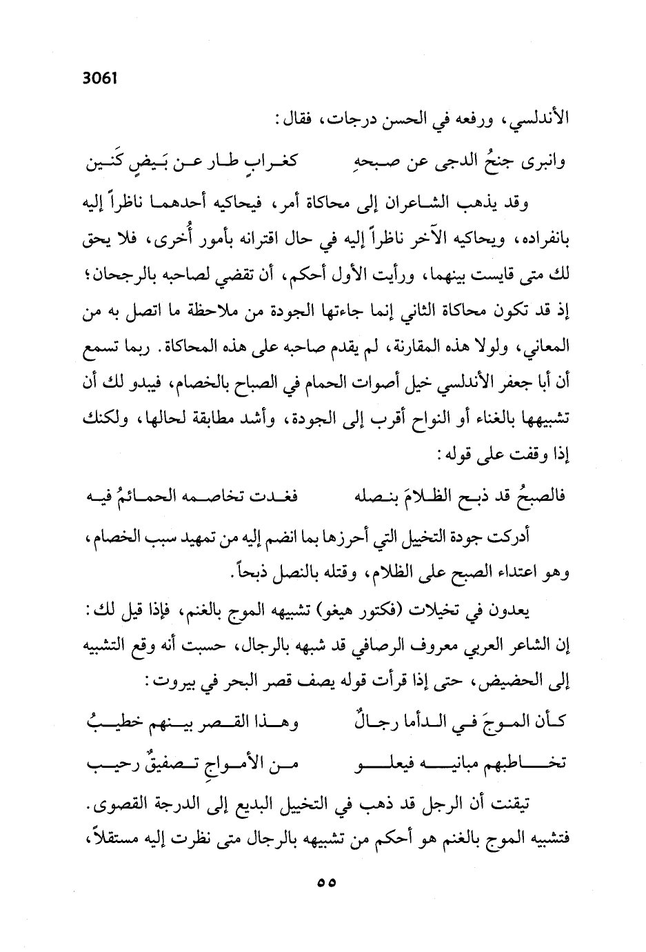 يعدون في تخيلات (فكتور هيغو) تشبيهه الموج بالغنم، فإذا قيل لك: إن الشاعر العربي معروف الرصافي قد شبهه بالرجال، حسبت أنه وقع التشبيه إلى الحضيض، حتى إذا قرأت قوله يصف قصر البحر في بيروت: