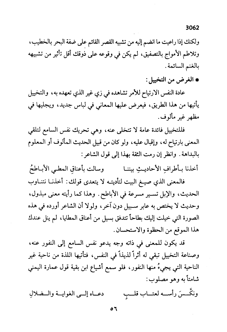 عادة النفس الارتياح للأمر تشاهده في زي غير الذي تعهده به، والتخييل يأتيها من هذا الطريق، فيعرض عليها المعاني في لباس جديد، ويجليها في مظهر غير مألوف.