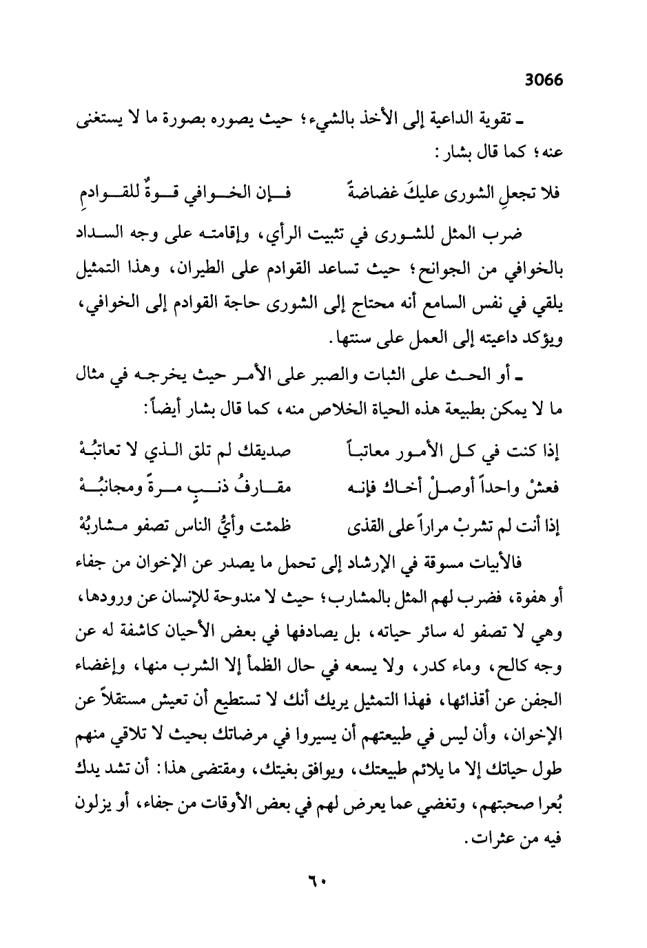 فالأبيات مسوقة في الإرشاد إلى تحمل ما يصدر عن الإخوان من جفاء أو هفوة، فضرب لهم المثل بالمشارب؛ حيث لا مندوحة للإنسان عن ورودها، وهي لا تصفو له سائر حياته، بل يصادفها في بعض الأحيان كاشفة له عن وجه كالح، وماء كدر، ولا يسعه في حال الظمأ إلا الشرب منها، وإغضاء الجفن عن أقذائها، فهذا التمثيل يريك أنك لا تستطيع أن تعيش مستقلاً عن الإخوان، وأن ليس في طبيعتهم أن يسيروا في مرضاتك بحيث لا تلاقي منهم طول حياتك إلا ما يلائم طبيعتك، ويوافق بغيتك، ومقتضى هذا: أن تشد يدك بُعرا صحبتهم، وتغضي عما يعرض لهم في بعض الأوقات من جفاء، أو يزلون فيه من عثرات.