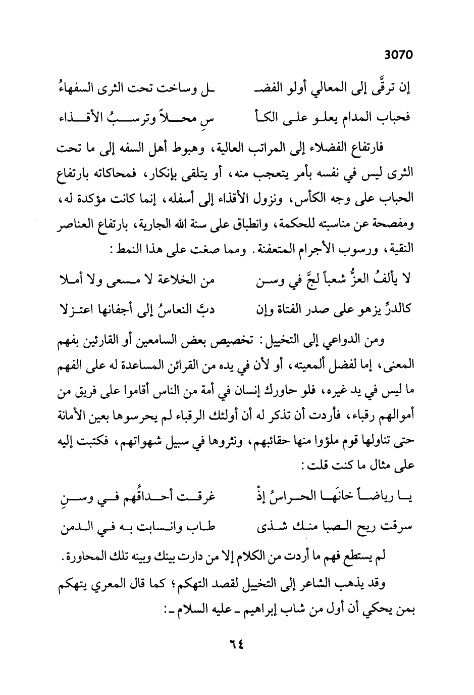 فارتفاع الفضلاء إلى المراتب العالية، وهبوط أهل السفه إلى ما تحت الثرى ليس في نفسه بأمر يتعجب منه، أو يتلقي بإنكار، فمحاكاته بارتفاع الحباب على وجه الكأس، ونزول الأقذاء إلى أسفله، إنما كانت مؤكدة له، ومفصحة عن مناسبته للحكمة، وانطباق على سنة الله الجارية، بارتفاع العناصر النقية، ورسوب الأجرام المتعفنة. ومما صغت على هذا النمط: