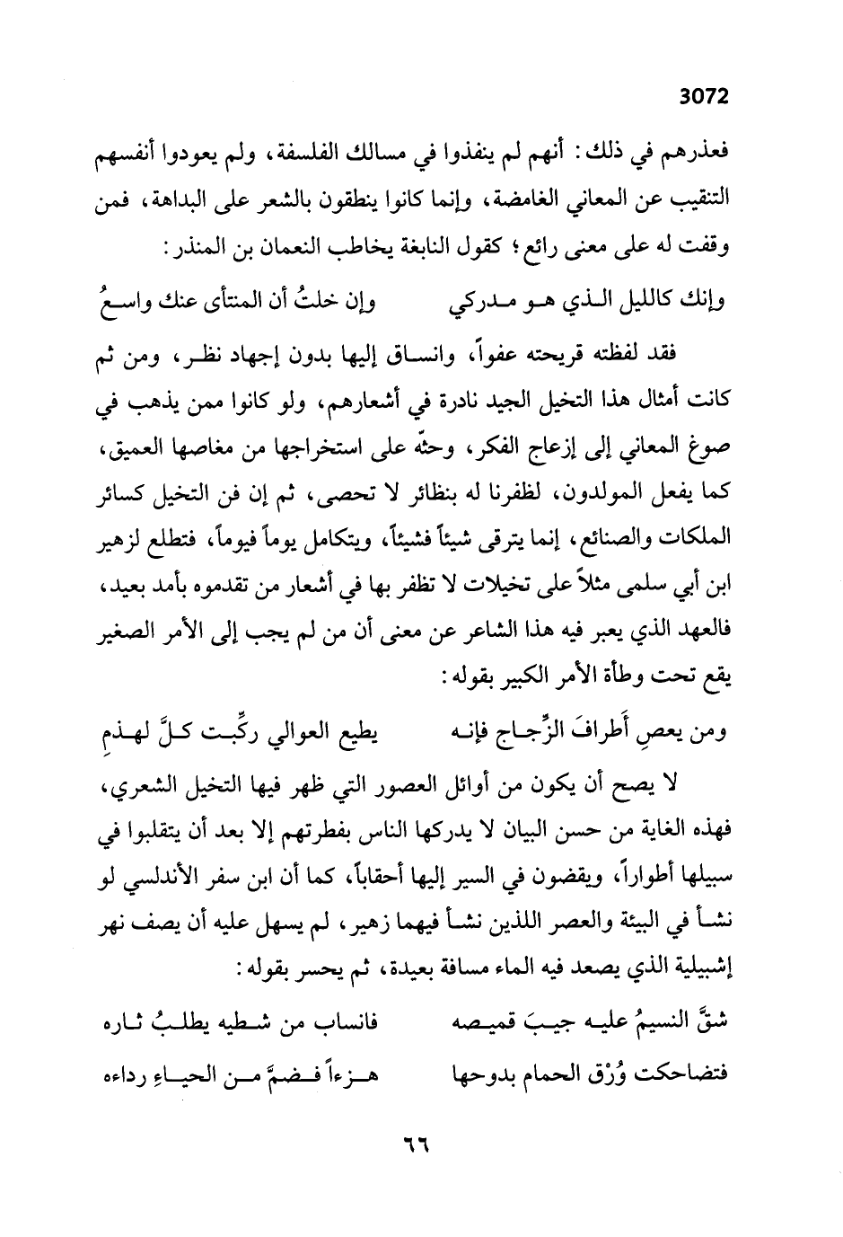 فقد لفظته قريحته عفواً، وانساق إليها بدون إجهاد نظر، ومن ثم كانت أمثال هذا التخيل الجيد نادرة في أشعارهم، ولو كانوا ممن يذهب في صوغ المعاني إلى إزعاج الفكر، وحثّه على استخراجها من مغاصها العميق، كما يفعل المولدون، لظفرنا له بنظائر لا تحصى، ثم إن فن التخيل كسائر الملكات والصنائع، إنما يترقى شيئاً فشيئاً، ويتكامل يوماً فيوماً، فتطلع لزهير ابن أبي سلمى مثلاً على تخيلات لا تظفر بها في أشعار من تقدموه بأمد بعيد، فالعهد الذي يعبر فيه هذا الشاعر عن معنى أن من لم يجب إلى الأمر الصغير يقع تحت وطأة الأمر الكبير بقوله:
