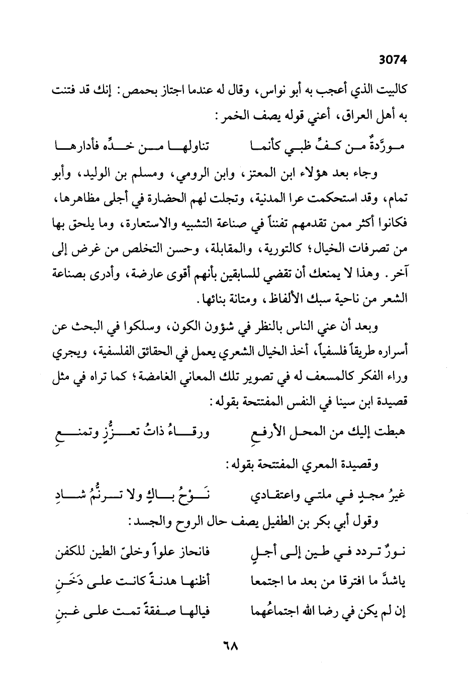 وجاء بعد هؤلاء ابن المعتز، وابن الرومي، ومسلم بن الوليد، وأبو تمام، وقد استحكمت عرا المدنية، وتجلت لهم الحضارة في أجلى مظاهرها، فكانوا أكثر ممن تقدمهم تفنناً في صناعة التشبيه والاستعارة، وما يلحق بها من تصرفات الخيال؛ كالتورية، والمقابلة، وحسن التخلص من غرض إلى آخر. وهذا لا يمنعك أن تقضي للسابقين بأنهم أقوى عارضة، وأدرى بصناعة الشعر من ناحية سبك الألفاظ، ومتانة بنائها.
