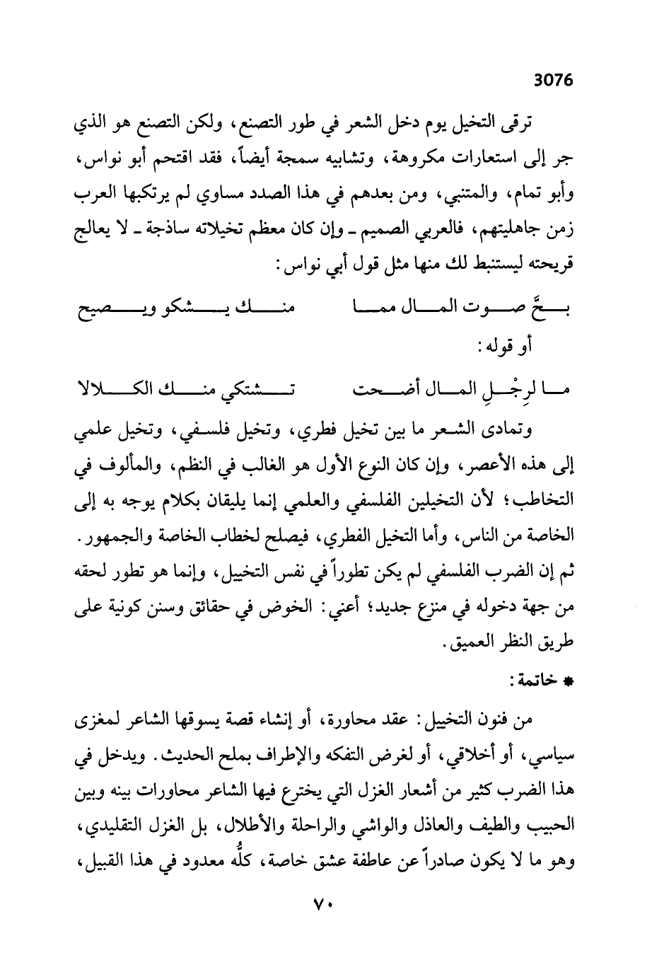وتمادى الشعر ما بين تخيل فطري، وتخيل فلسفي، وتخيل علمي إلى هذه الأعصر، وإن كان النوع الأول هو الغالب في النظم، والمألوف في التخاطب؛ لأن التخيلين الفلسفي والعلمي إنما يليقان بكلام يوجه به إلى الخاصة من الناس، وأما التخيل الفطري، فيصلح لخطاب الخاصة والجمهور. ثم إن الضرب الفلسفي لم يكن تطوراً في نفس التخييل، وإنما هو تطور لحقه من جهة دخوله في منزع جديد؛ أعني: الخوض في حقائق وسنن كونية على طريق النظر العميق.