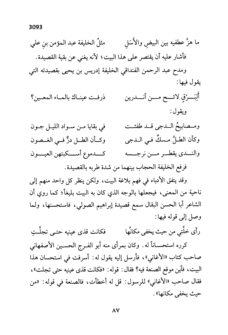 كرره استحساناً له. وكان بمرأى منه أبو الفرج الحسين الأصفهاني صاحب كتاب "الأغاني "، فأرسل إليه يقول له: أسرفت في استحسان هذا البيت، فأين موقع الصنعة فيه؟ فقال: قوله: "فكانت قذى عينيه حتى تجلت "، فقال صاحب "الأغاني " للرسول: قل له أخطأت، فالصنعة في قوله: "من حيث يخفى مكانها".