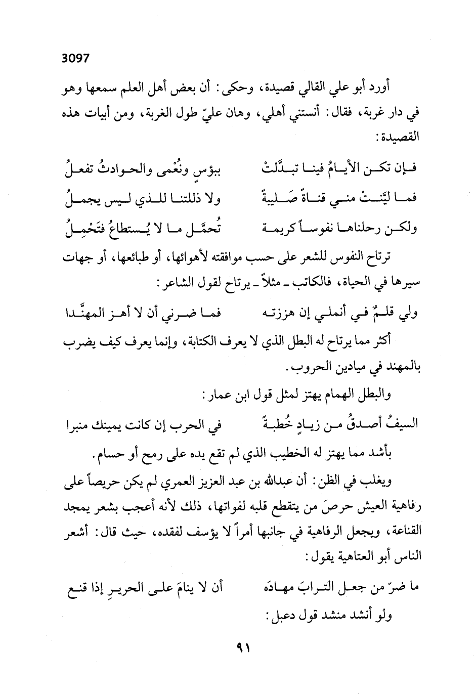 أورد أبو علي القالي قصيدة، وحكى: أن بعض أهل العلم سمعها وهو في دار غربة، فقال: أنستني أهلي، وهان عليّ طول الغربة، ومن أبيات هذه القصيدة: