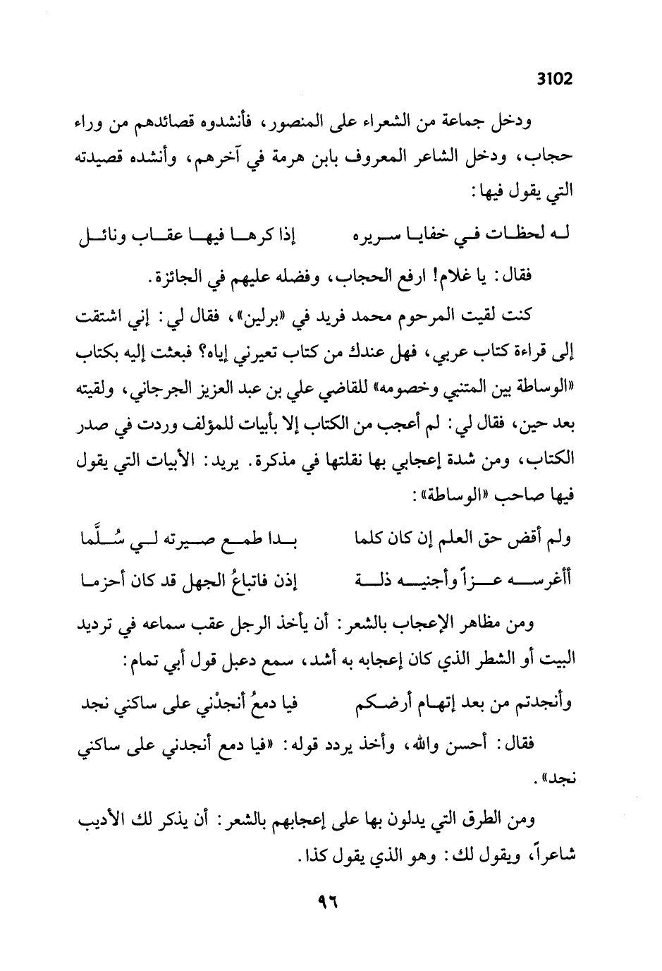 كنت لقيت المرحوم محمد فريد في "برلين"، فقال لي: إني اشتقت إلى قراءة كتاب عربي، فهل عندك من كتاب تعيرني إياه؟ فبعثت إليه بكتاب "الوساطة بين المتنيي وخصومه" للقاضي علي بن عبد العزيز الجرجاني، ولقيته بعد حين، فقال لي: لم أعجب من الكتاب إلا بأبيات للمؤلف وردت في صدر الكتاب، ومن شدة إعجابي بها نقلتها في مذكرة. يريد: الأبيات التي يقول فيها صاحب "الوساطة":