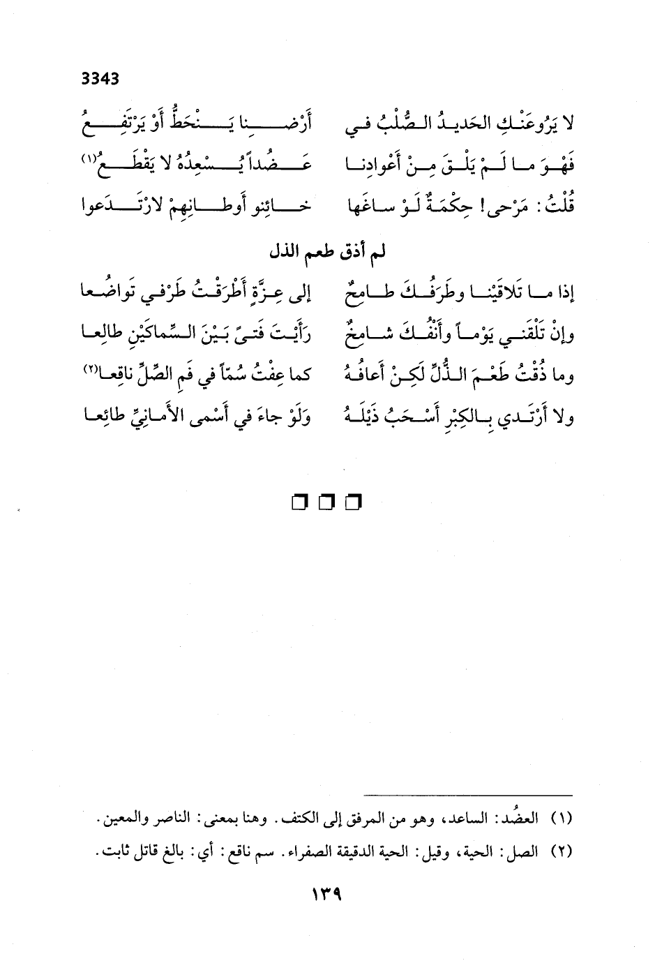 وما ذُقْتُ طَعْمَ الذُّلِّ لَكِنْ أَعافُهُ ... كما عِفْتُ سُمّاً في فَمِ الصِّلِّ ناقِعا (¬2)