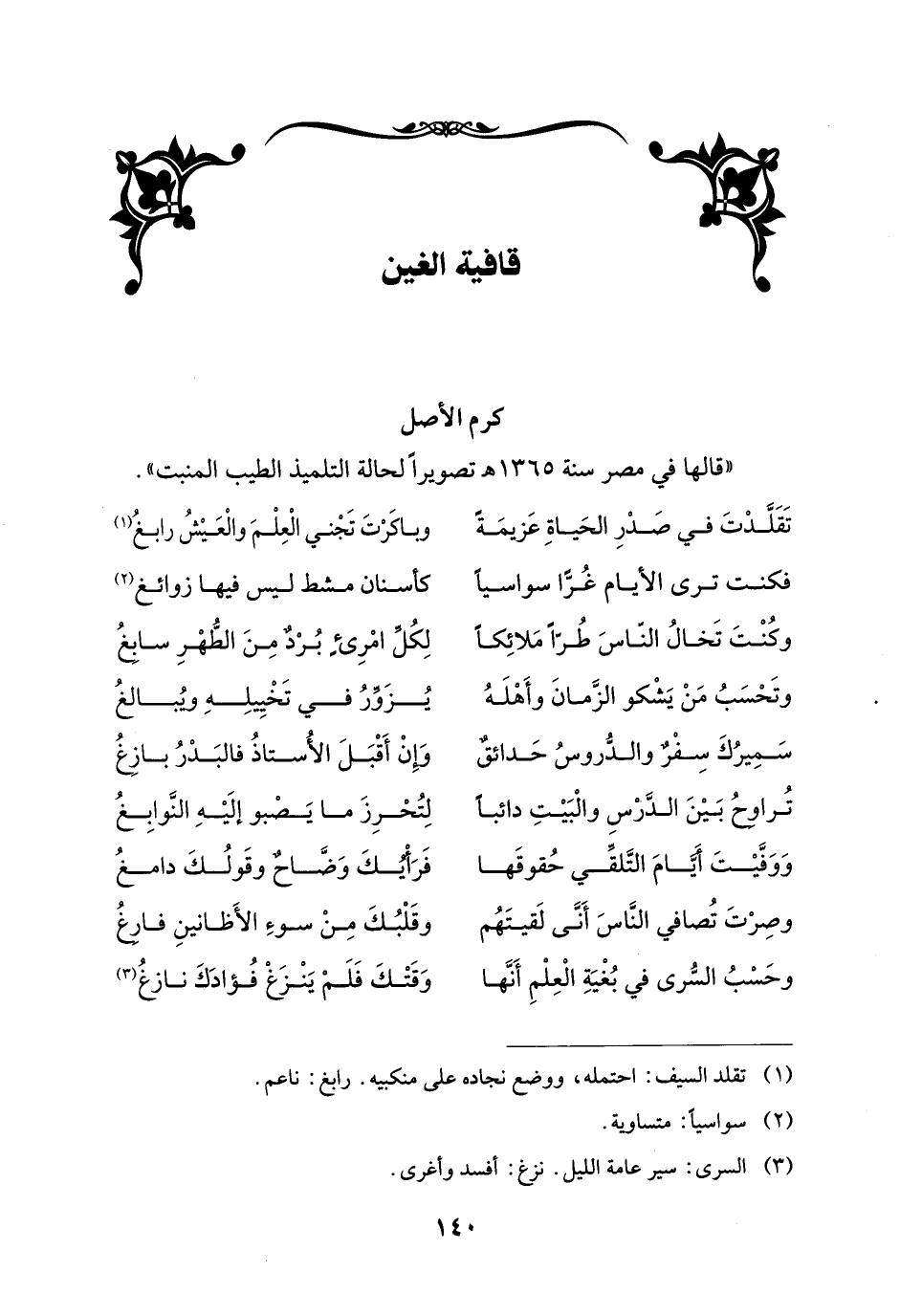 تَقَلَّدْتَ في صَدْرِ الحَياةِ عَزيمَةً ... وباكَرْتَ تَجْني الْعِلْمَ والْعَيْشُ رابغُ (¬1)