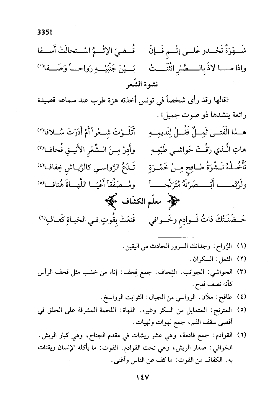 تأْخُذْهُ نَشْوَةُ طافِحٍ مِنْ خَمْرَةٍ ... تَدَعُ الرَّواسي كالرِّياشِ خِفافا (¬4)