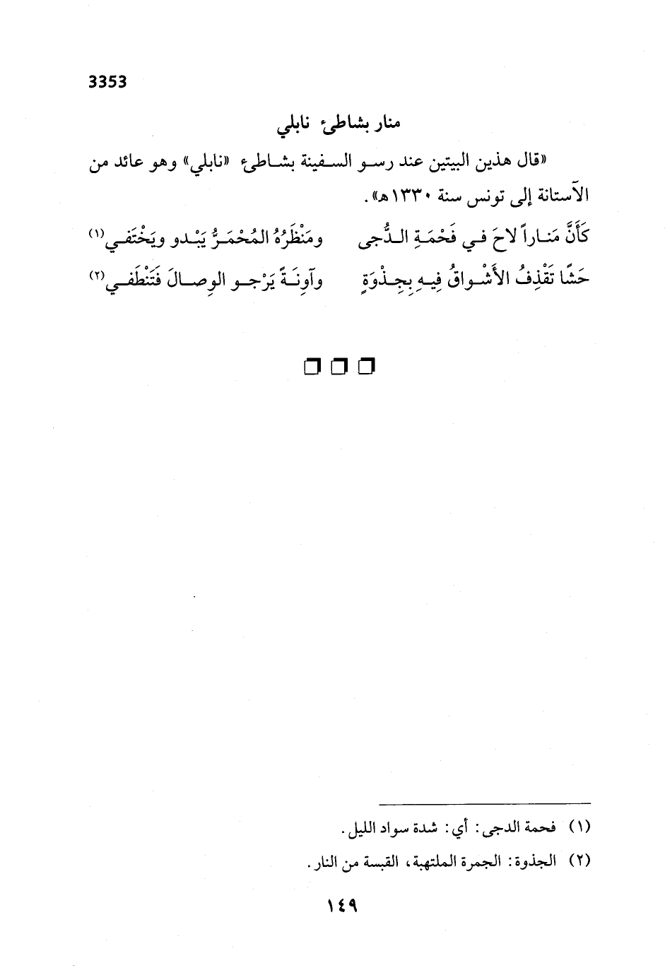 " قال هذين البيتين عند رسو السفينة بشاطئ "نابلي" وهو عائد من الآستانة إلى تونس سنة 1335 هـ ".