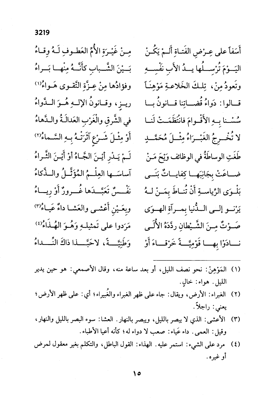 (¬3) الأعشى: الذي لا يبصر بالليل، ويبصر بالنهار. العشا: سوء البصر بالليل والنهار، وقيل: العمى. داء عَياء: صعب لا دواء له؛ كأنه أعيا الأطباء.