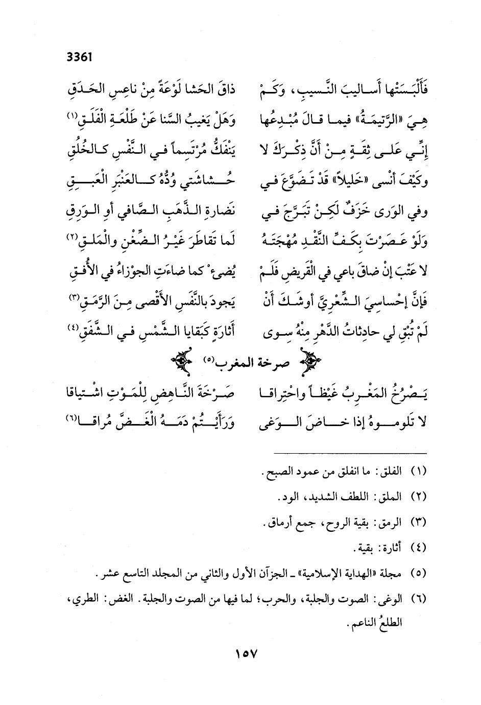 يَصْرُخُ المَغْرِبُ غَيْظاً واحْتِراقا ... صَرْخَةَ النَّاهِضِ لِلْمَوْتِ اشْتياقا