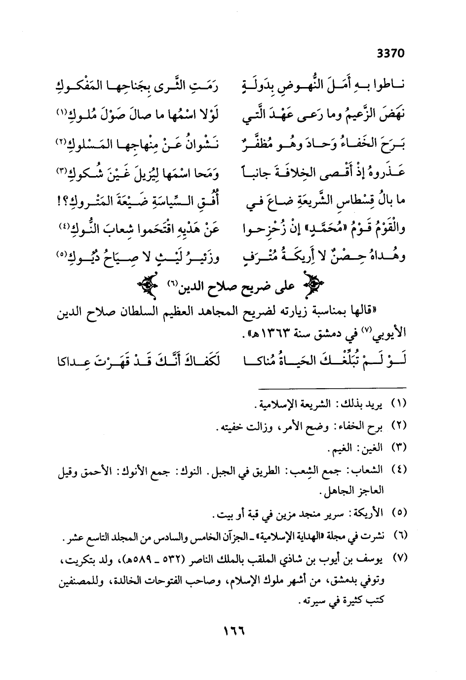 " قالها بمناسبة زيارته لضريح المجاهد العظيم السلطان صلاح الدين الأيوبي (¬7) في دمشق سنة 1363 هـ ".
