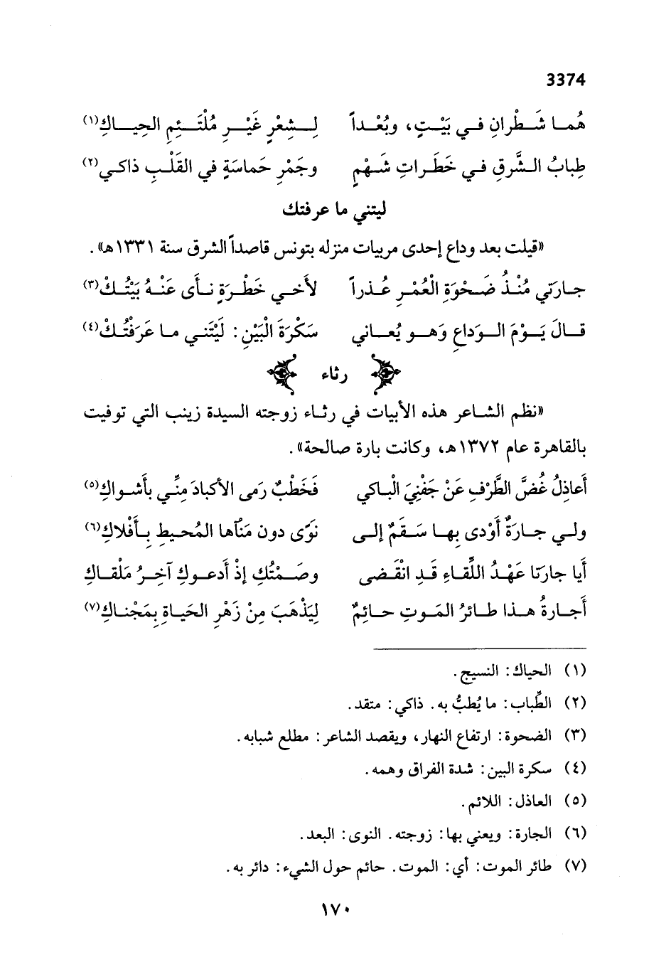 " نظم الشاعر هذه الأبيات في رثاء زوجته السيدة زينب التي توفيت بالقاهرة عام 1372 هـ، وكانت بارة صالحة".