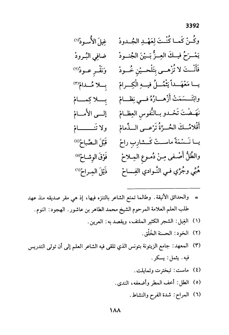 (¬3) المعهد: جامع الزيتونة بتونس الذي تلقى فيه الشاعر العلم إلى أن تولى التدريس فيه. يثمل: يسكر.