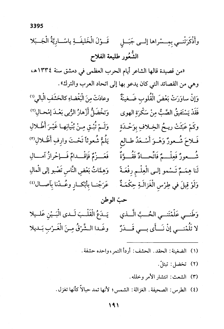 " من قصيدة قالها الشاعر أيام الحرب العظمى في دمشق سنة 1334 هـ , وهي من القصائد التي كان يدعو بها إلى اتحاد العرب والترك".