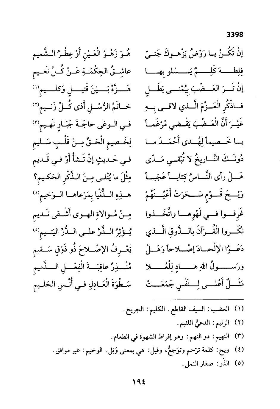 فاذْكُرِ الْعَزْمَ الَّذي لاقى بِهِ ... خاتَمُ الرُّسْلِ أَذى كُلِّ زَنيمِ (¬2)