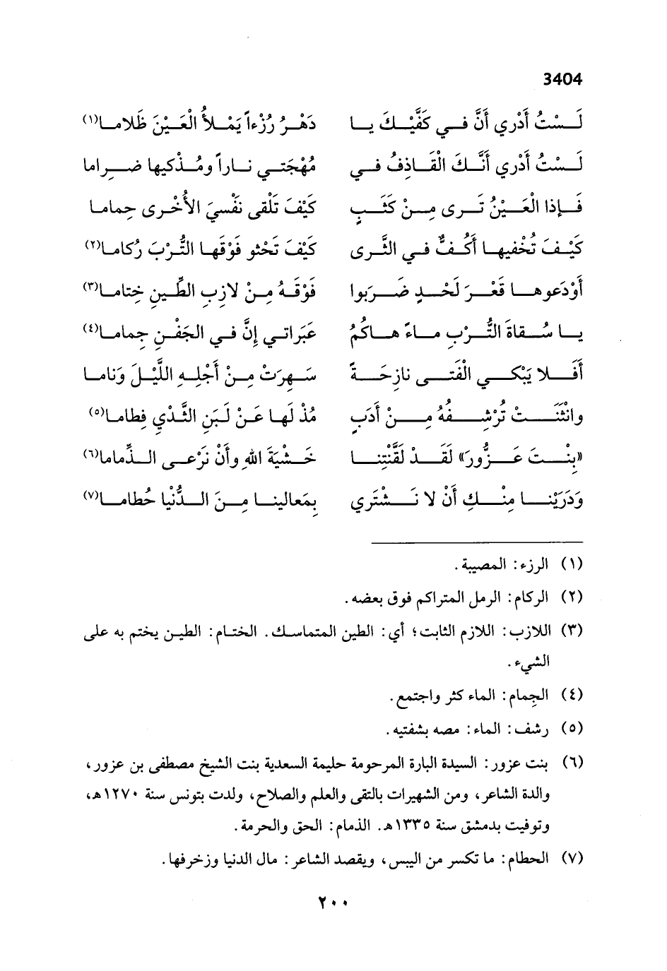 (¬6) بنت عزور: السيدة البارة المرحومة حليمة السعدية بنت الشيخ مصطفى بن عزور، والدة الشاعر، ومن الشهيرات بالتقى والعلم والصلاح، ولدت بتونس سنة 1270 هـ , وتوفيت بدمشق سنة 1335 هـ. الذمام: الحق والحرمة.