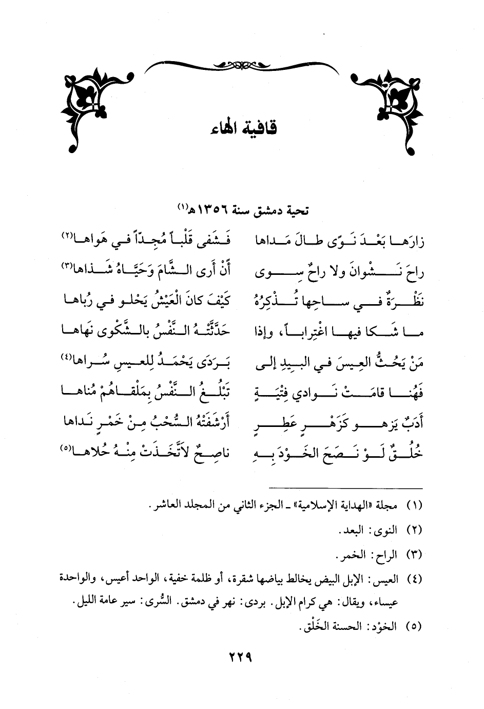 (¬4) العيس: الإبل البيض يخالط بياضها شقرة، أو ظلمة خفية، الواحد أعيس، والواحدة عيساء، ويقال: هي كرام الإبل. بردى: نهر في دمشق. السُّرى: سير عامة الليل.