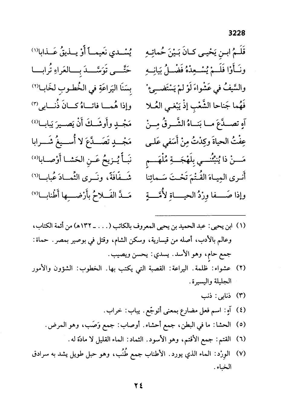 (¬1) ابن يحيى: عبد الحميد بن يحيى المعروف بالكاتب (... - 132 هـ) من أئمة الكتاب، وعالم بالأدب، أصله من قيسارية، وسكن الشام، وقتل في بوصير بمصر. حماة: جمع حامٍ، وهو الأسد. يسدي: يحسن ويصيب.