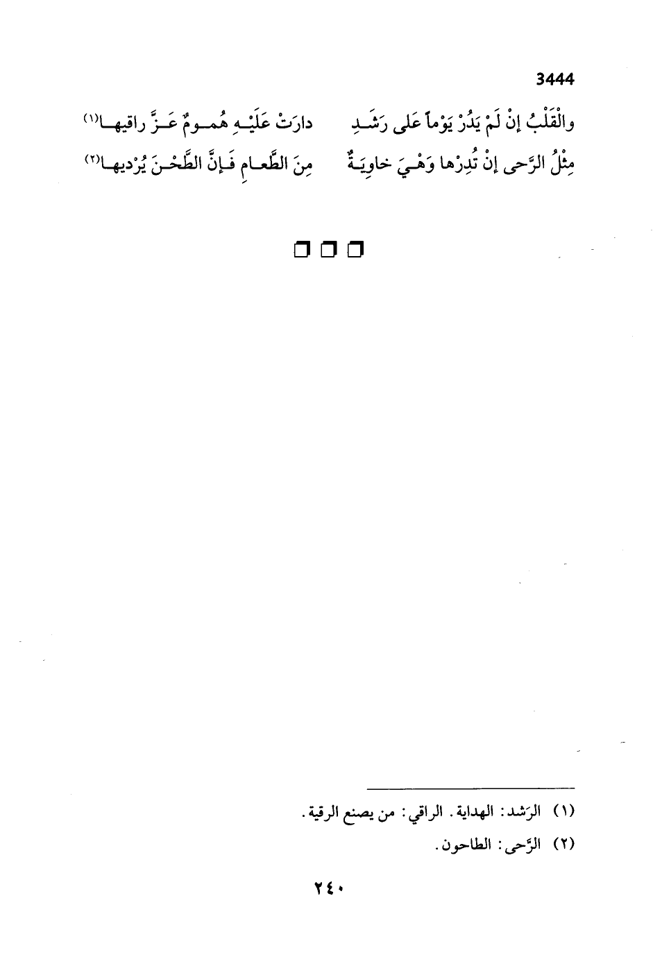 والْقَلْبُ إنْ لَمْ يَدُرْ يَوْماً عَلى رَشَدِ ... دارَتْ عَلَيْهِ هُمومٌ عَزَّ راقيها (¬1)