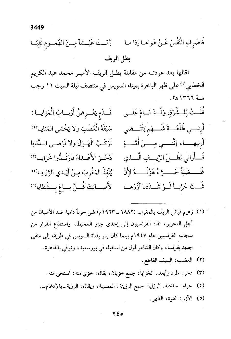 (¬1) زعيم قبائل الريف بالمغرب (1882 - 1963 م) شن حرباً دامية ضد الأسبان من أجل التحرير، نفاه الفرنسيون إلى إحدى جزر المحيط، واستطاع الفرار من سجانيه الفرنسيين عام 1947 م بينما كان يمر بقناة السويس في طريقه إلى منفى جديد بفرنسا، وكان الشاعر أول من استقبله في بورسعيد، وتوفي بالقاهرة.