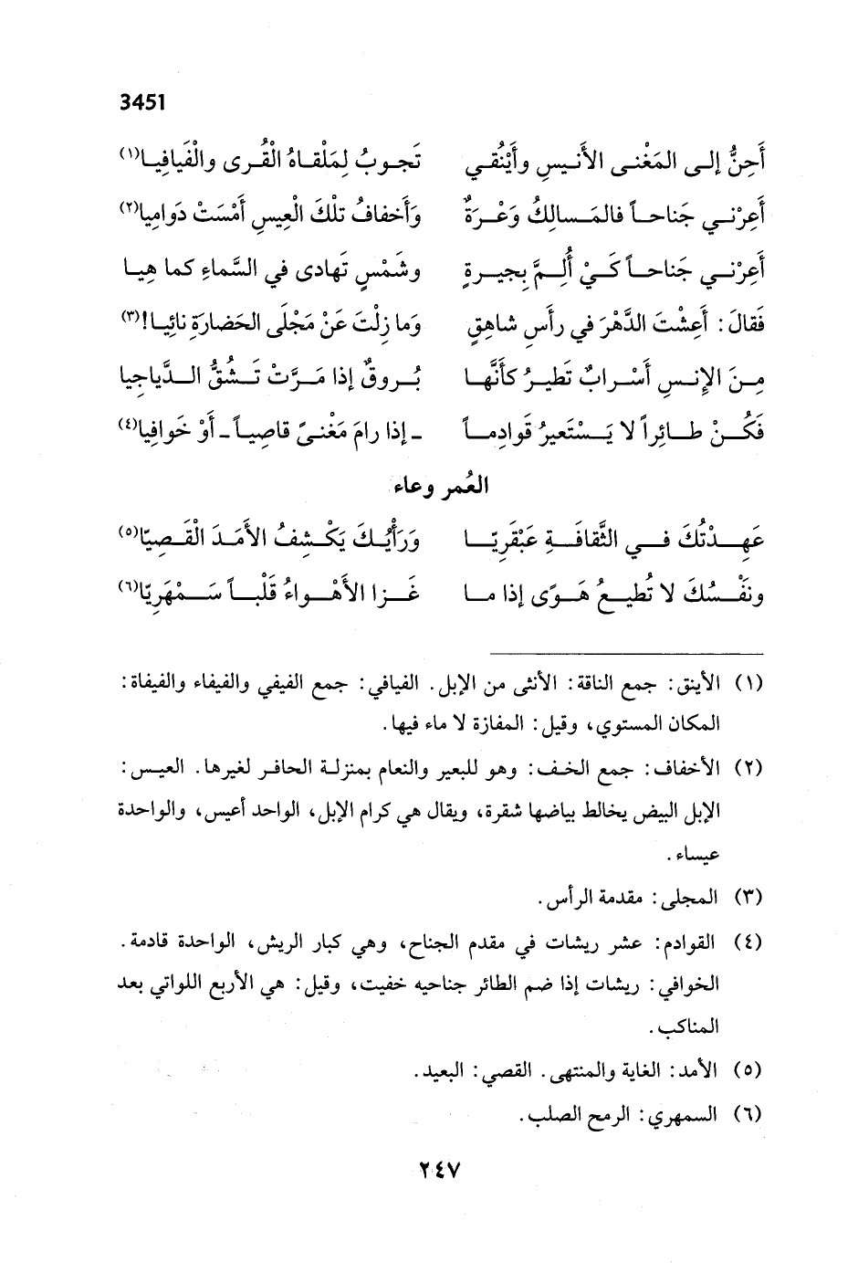 (¬1) الأينق: جمع الناقة: الأنثى من الإبل. الفيافي: جمع الفيفي والفيفاء والفيفاة: المكان المستوي، وقيل: المفازة لا ماء فيها.