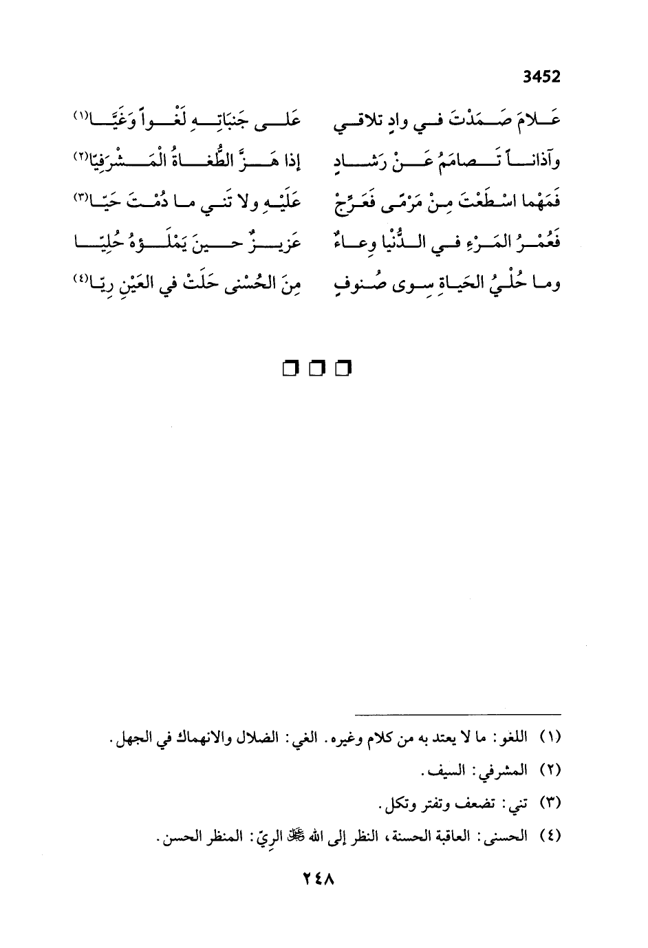 فَمَهْما اسْطَعْتَ مِنْ مَرْمَى فَعَرِّجْ ... عَلَيْهِ ولا تَني ما دُمْتَ حَيّا (¬3)