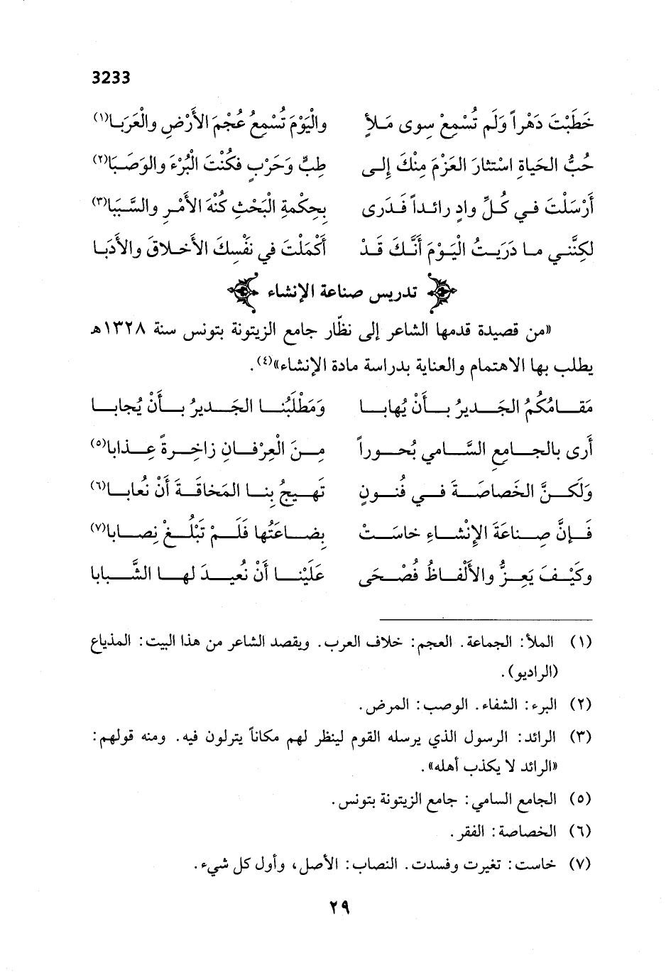 " من قصيدة قدمها الشاعر إلى نظّار جامع الزيتونة بتونس سنة 1328 هـ يطلب بها الاهتمام والعناية بدراسة مادة الإنشاء" (¬4).
