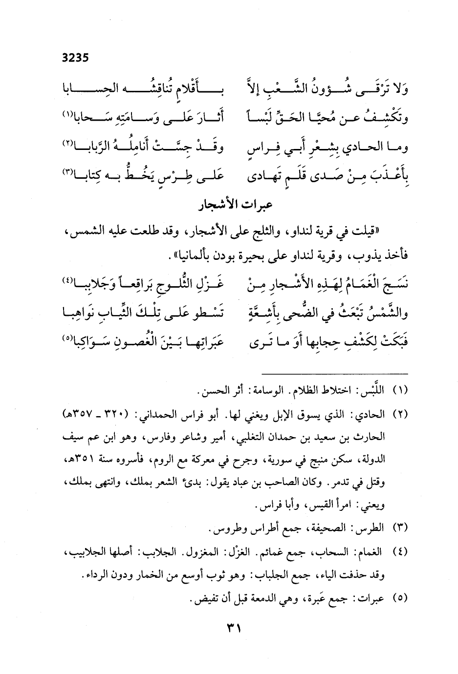 (¬2) الحادي: الذي يسوق الإبل ويغني لها. أبو فراس الحمداني: (320 - 357 هـ) الحارث بن سعيد بن حمدان التغلبي، أمير وشاعر وفارس، وهو ابن عم سيف الدولة، سكن منبج في سورية، وجرح في معركة مع الروم، فاسروه سنة 351 هـ , وقتل في تدمر. وكان الصاحب بن عباد يقول: بدئ الشعر بملك، وانتهى بملك، ويعني: امرأ القيس، وأبا فراس.