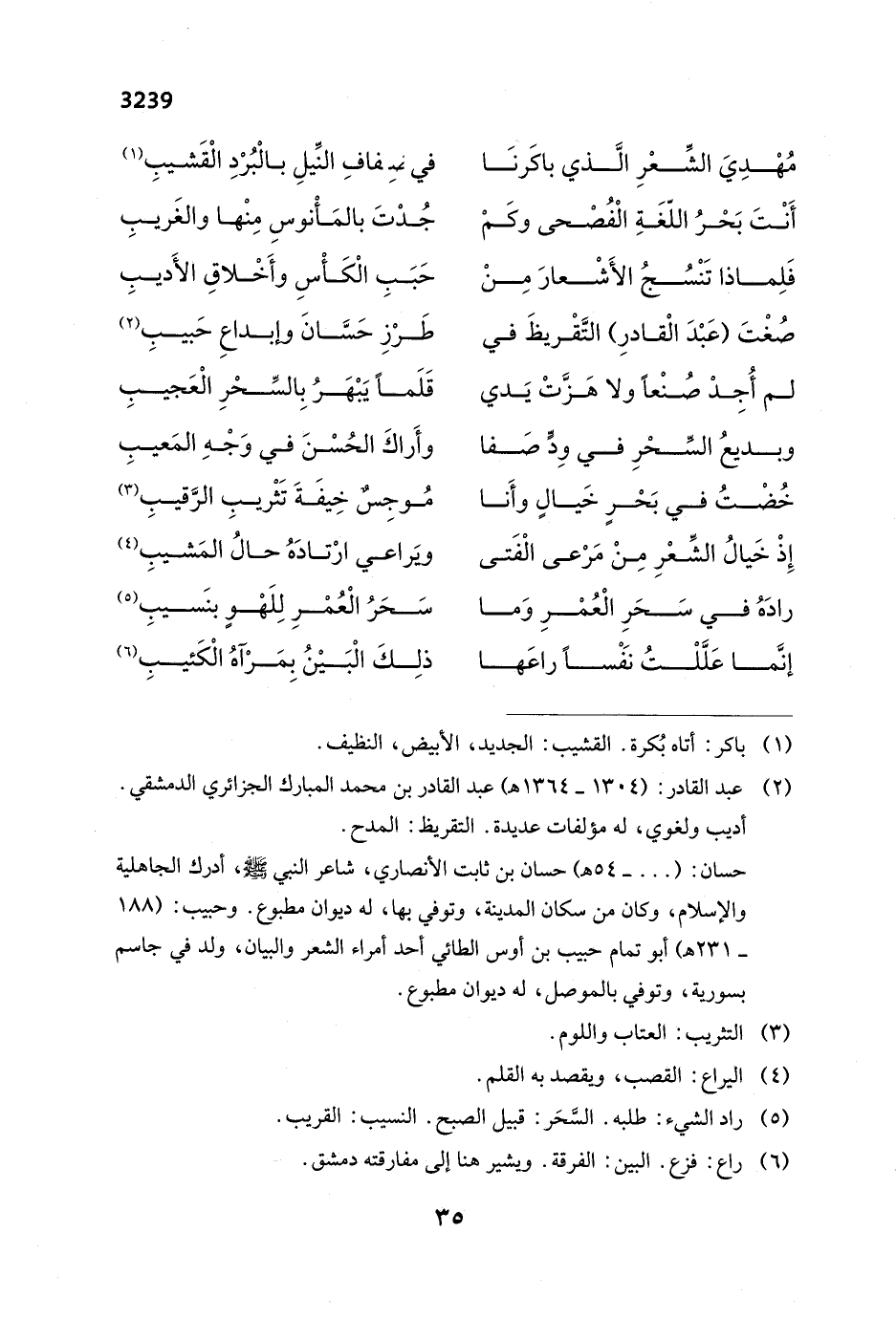 مُهْدِيَ الشِّعْرِ الَّذي باكَرنَا ... في ضفافِ النِّيلِ بالْبُرْدِ الْقَشيبِ (¬1)