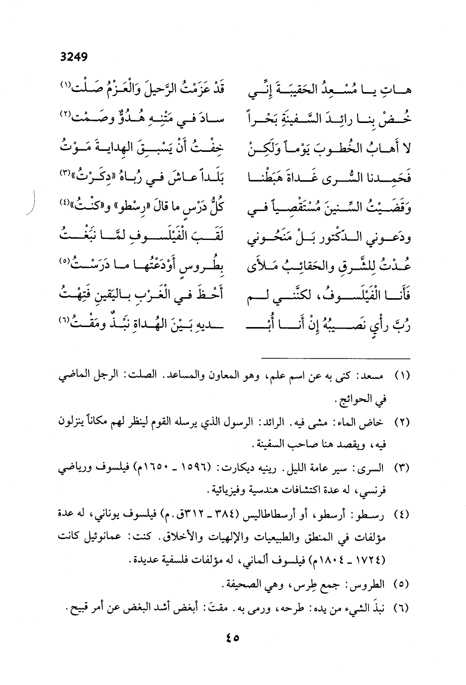 وَقَضَيْتُ السِّنينَ مُسْتَقْصِياً في ... كُلُّ درْسٍ ما قالَ "رِسْطو" و"كنْتُ" (¬4)
