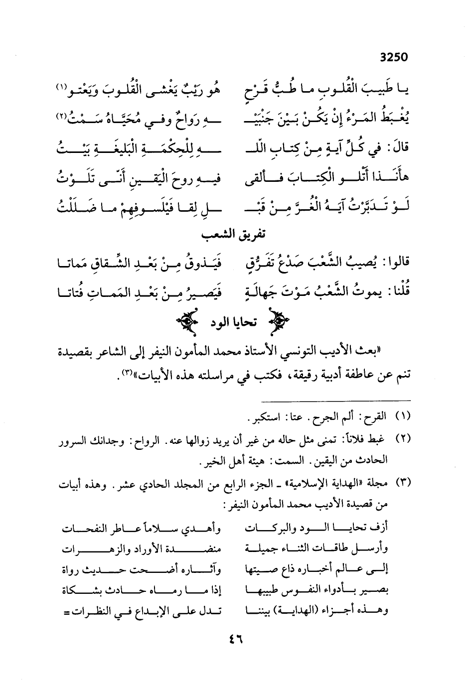 (¬3) مجلة "الهداية الإِسلامية" الجزء الرابع من المجلد الحادي عشر. وهذه أبيات من قصيدة الأديب محمد المأمون النيفر: