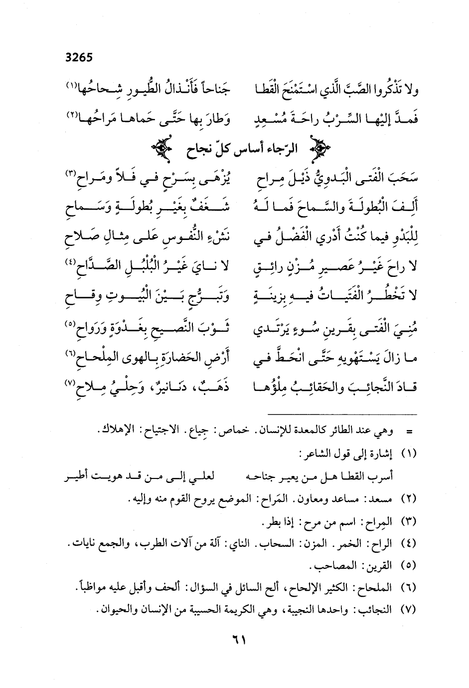 سَحَبَ الْفَتى الْبَدوِيُّ ذَيْلَ مِراحِ ... يُزْهَى بِسَرْح في فَلاً ومَراحِ (¬3)