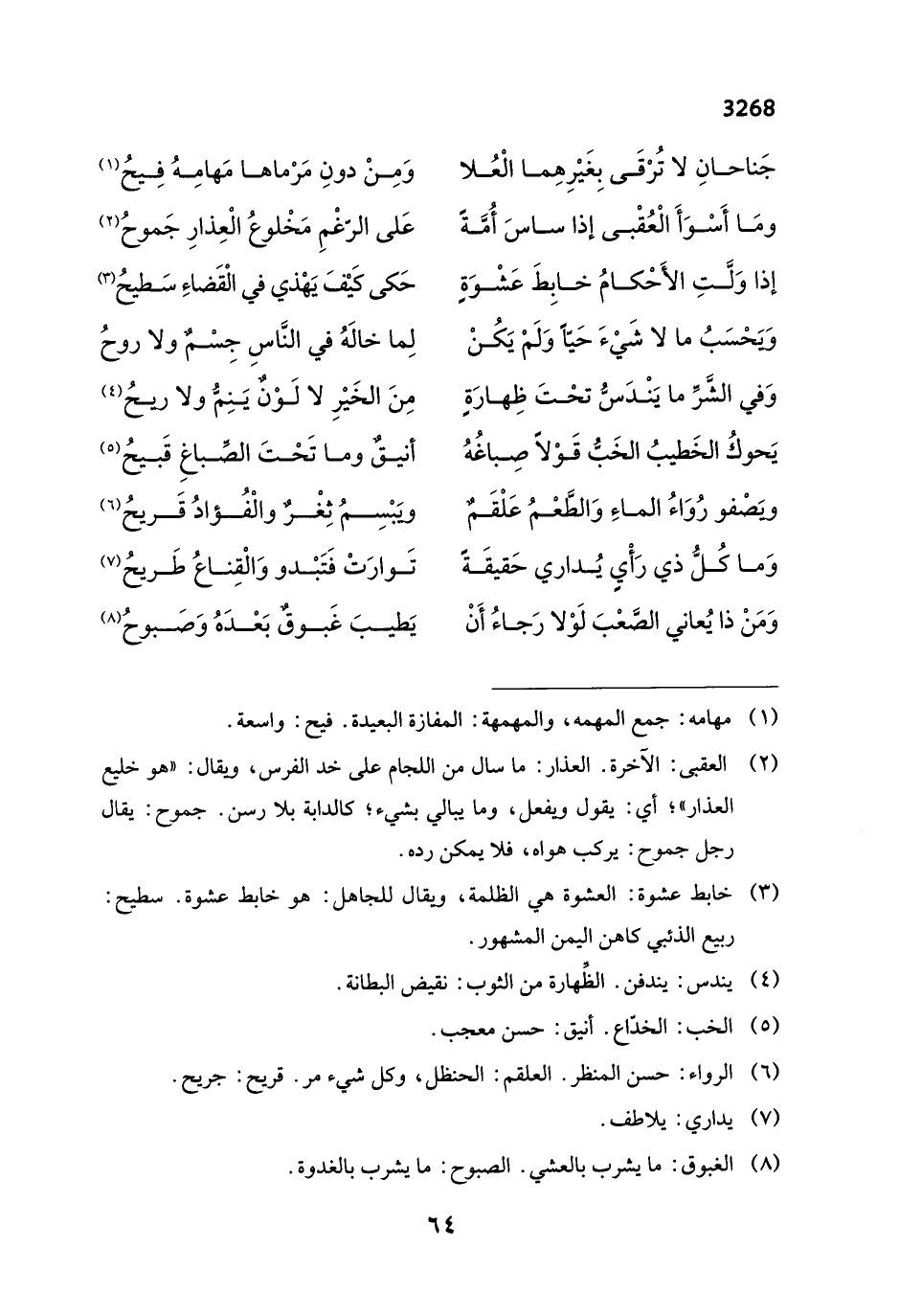 جَناحانِ لا تُرْقَى بِغَيْرِهِما الْعُلا ... وَمِنْ دونِ مَرْماها مَهامِهُ فِيحُ (¬1)