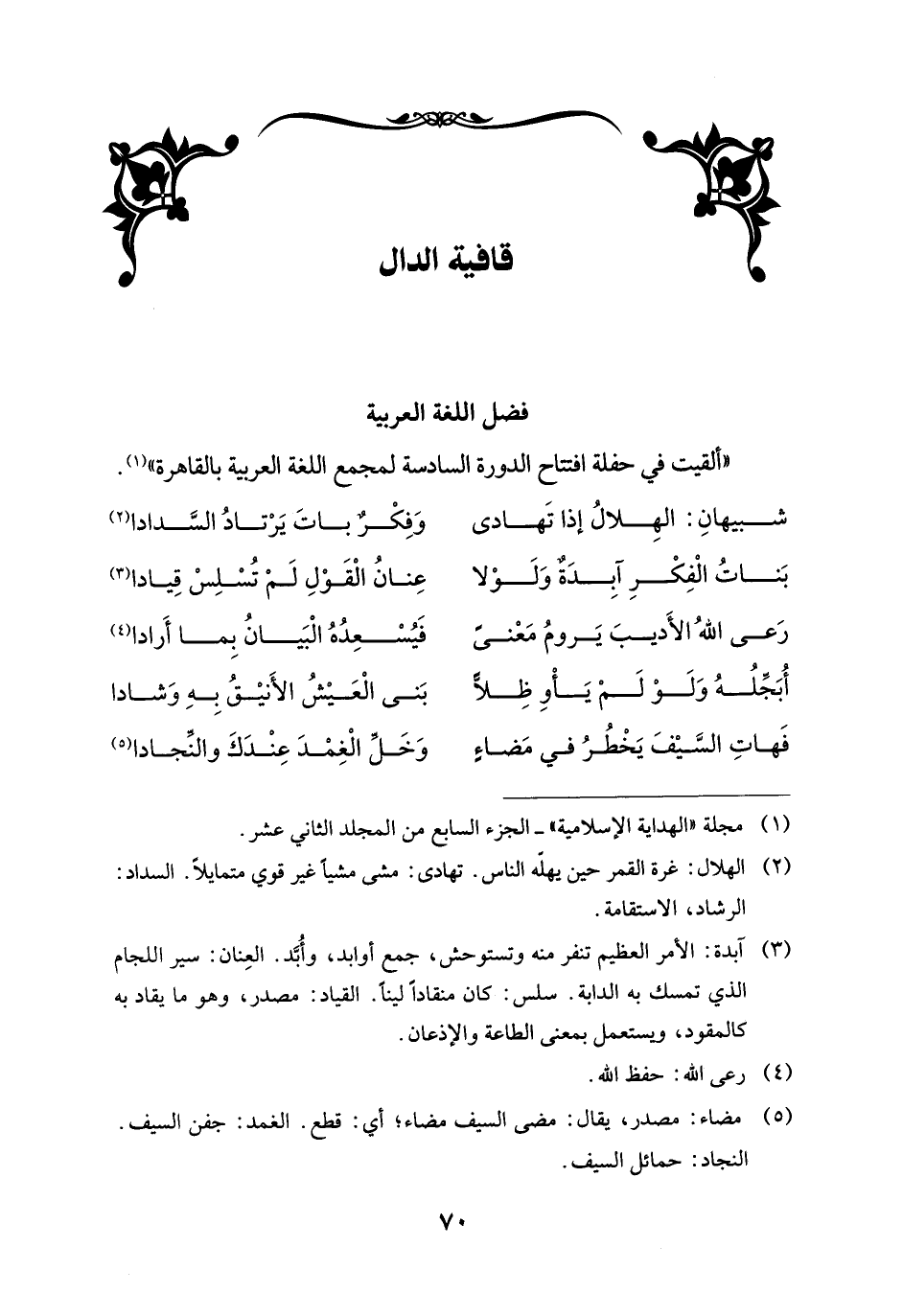 " ألقيت في حفلة افتتاح الدورة السادسة لمجمع اللغة العربية بالقاهرة" (¬1).
