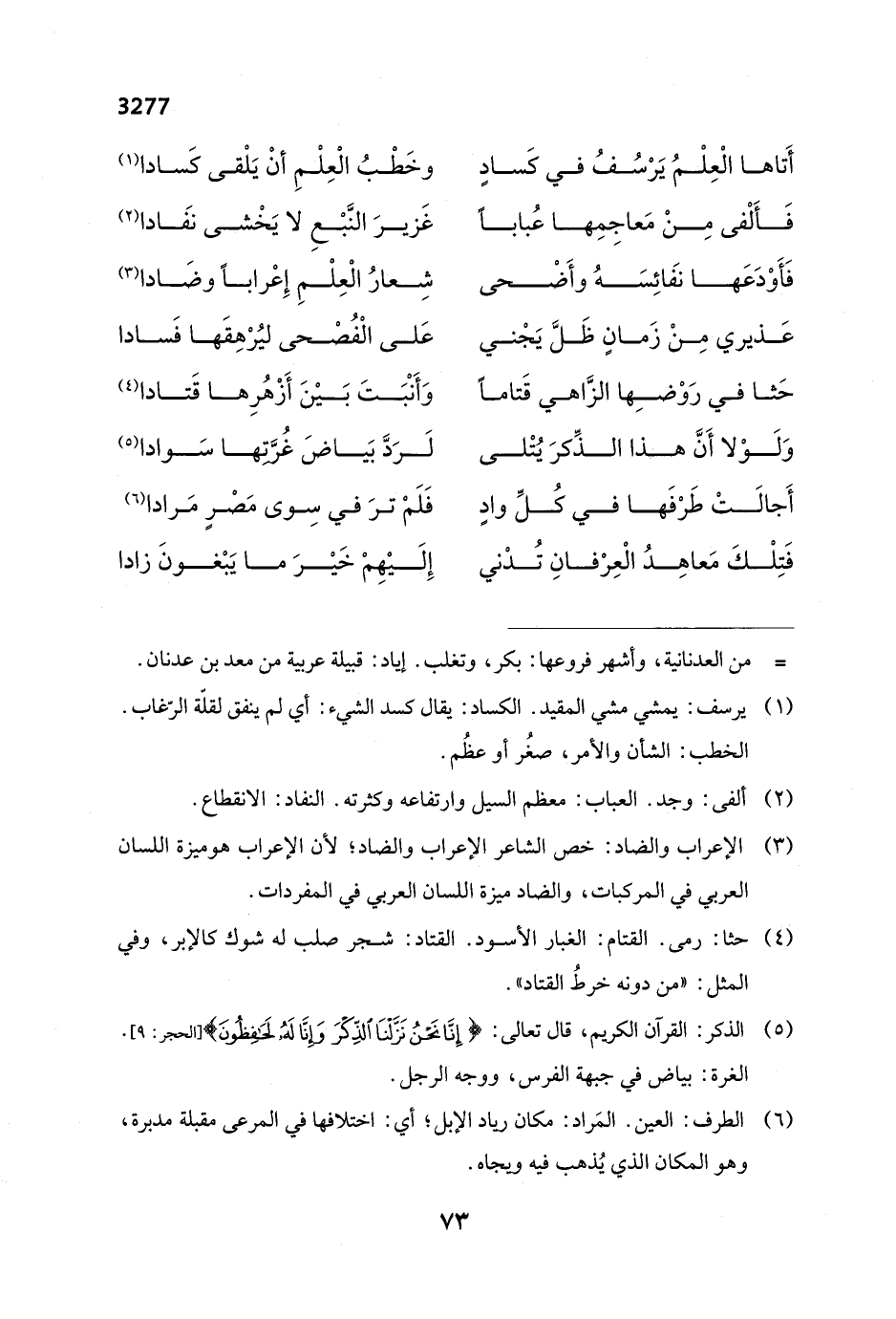 (¬3) الإعراب والضاد: خص الشاعر الإعراب والضاد؛ لأن الإعراب هو ميزة اللسان العربي في المركبات، والضاد ميزة اللسان العربي في المفردات.